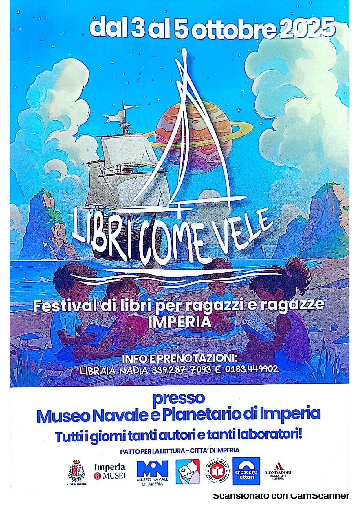 Il 3, 4 e 5 ottobre 2025 Imperia ospiterà la prima edizione di “Libri come Vele”, il nuovo Festival di letteratura per ragazzi che animerà il Museo Navale e il Planetario con tre giornate dedicate alla lettura, all’immaginazione e alla scoperta.