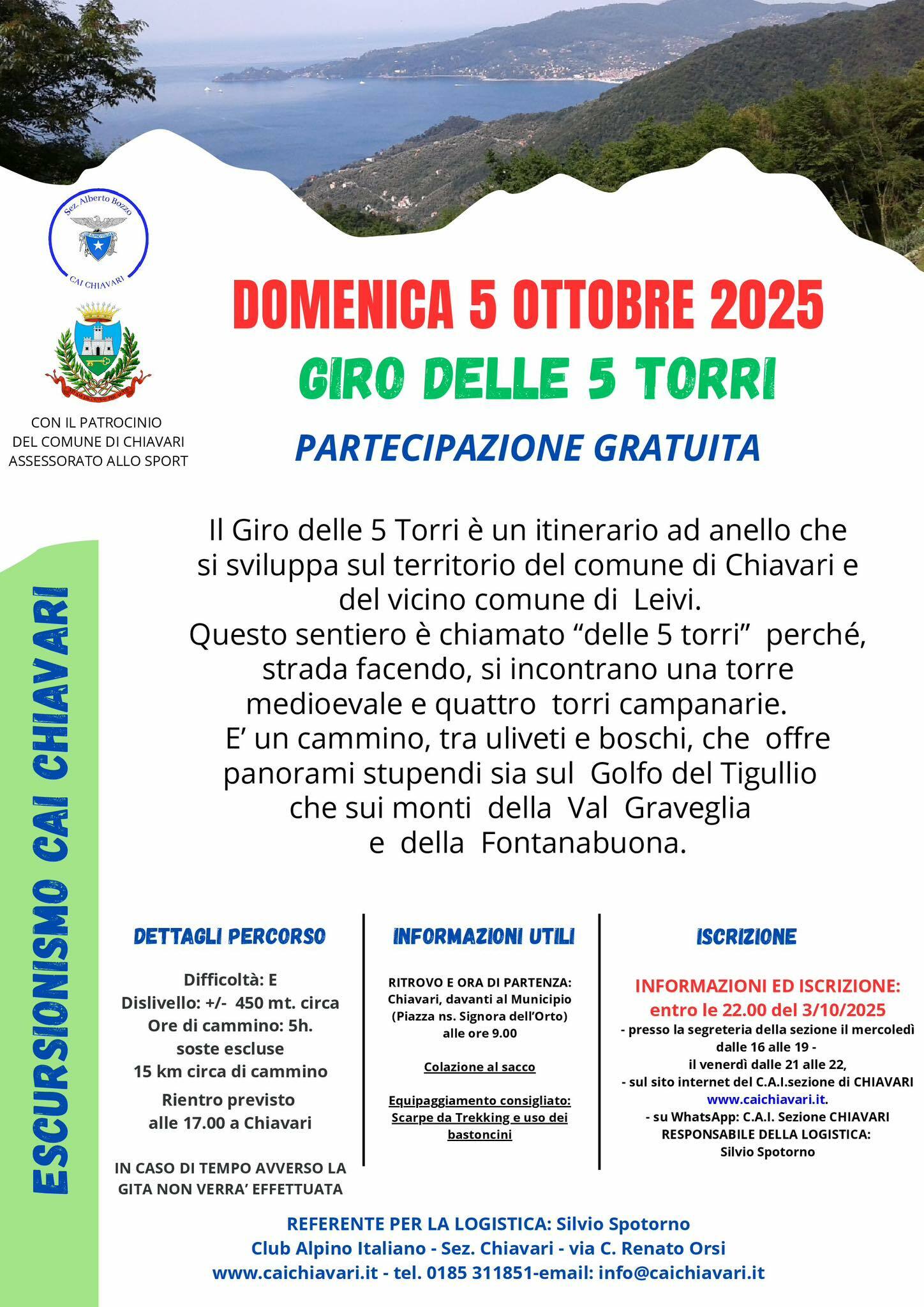 Il Giro delle 5 Torri è un itinerario ad anello che si sviluppa sul territorio del comune di Chiavari e del vicino comune di Leivi.