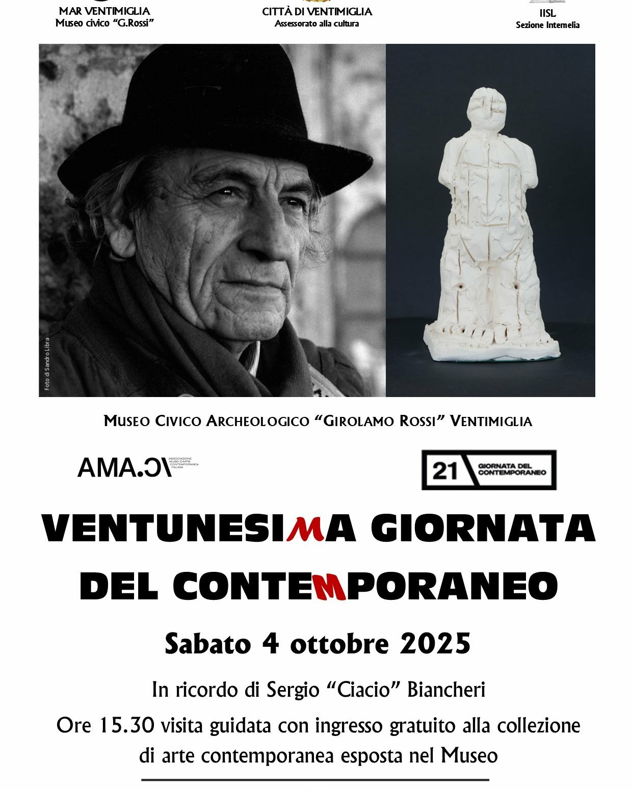 Sabato 4 ottobre 2025 il MAR Museo Civico Archeologico “Girolamo Rossi” di Ventimiglia partecipa alla Ventunesima edizione della Giornata del Contemporaneo, la grande manifestazione annuale promossa da AMACI (Associazione Musei d'Arte Contemporanea Italiani), durante la quale oltre mille realtà pubbliche e private in tutta Italia apriranno gratuitamente le loro porte al pubblico, con una programmazione speciale di eventi e iniziative pensate per avvicinare l’arte contemporanea a un pubblico sempre più ampio e trasversale.