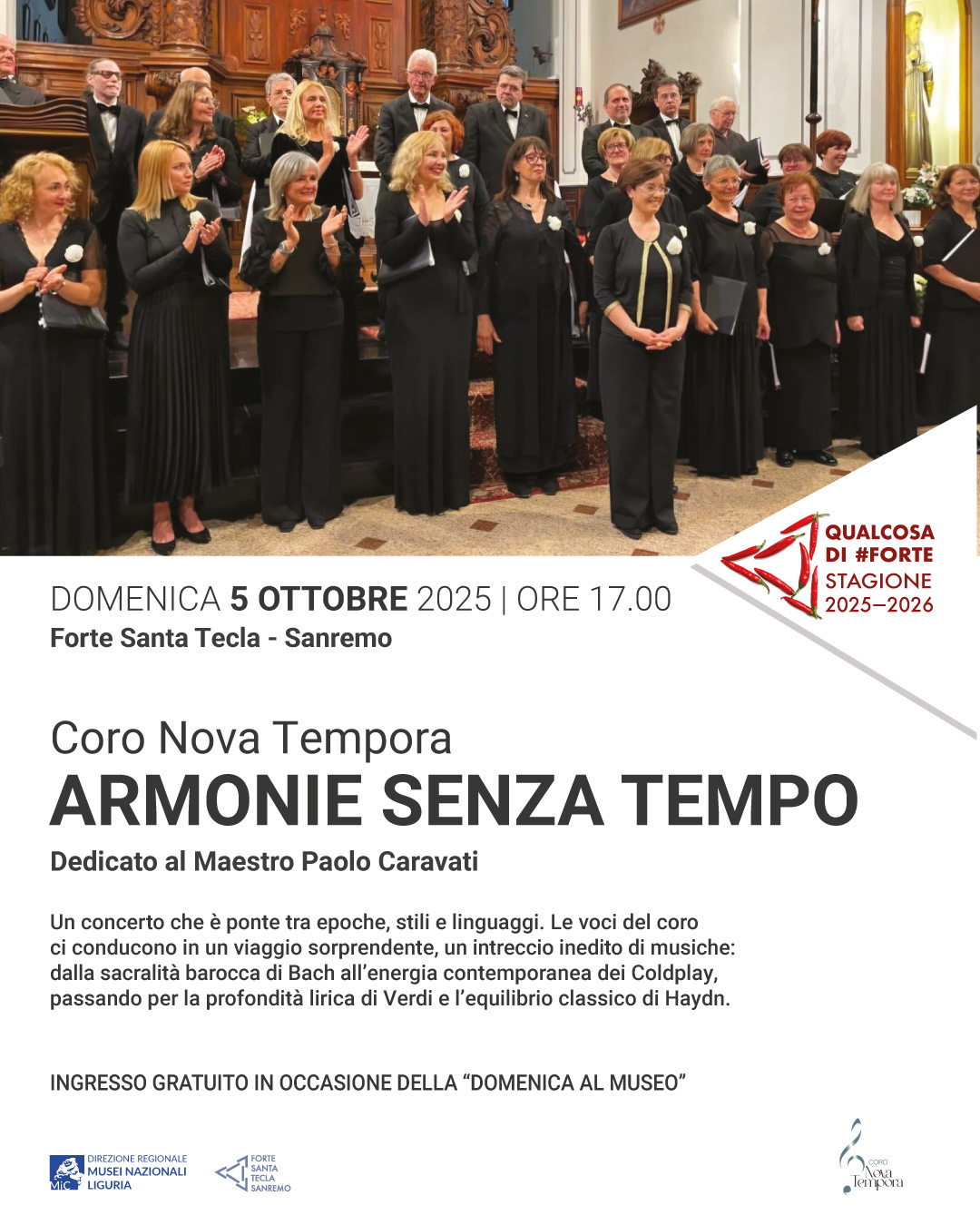 Domenica 5 ottobre alle ore 17, il Forte Santa Tecla ospita il concerto del Coro Nova Tempora, dal titolo Armonie senza tempo, dedicato al Maestro Paolo Caravati.