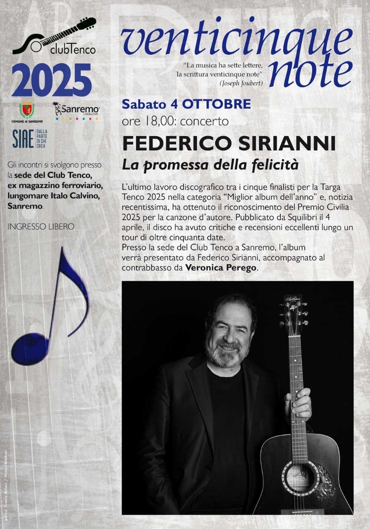 Uscito il 4 aprile scorso e pubblicato da Squilibri Editore, “La promessa della felicità", ultimo lavoro discografico di Federico Sirianni, è stato fra i cinque finalisti per la Targa Tenco 2025 nella categoria "Miglior album dell'anno" e ha ottenuto recentemente il riconoscimento del Premio Civilia 2025 per la canzone d'autore.