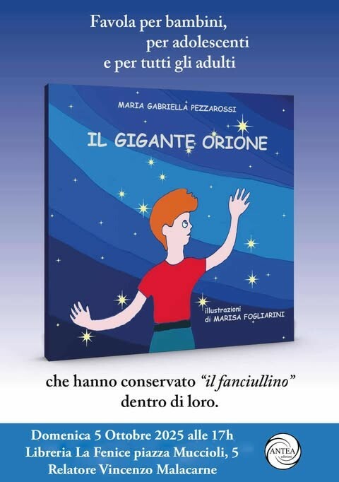 La Libreria La Fenice libri antichi e moderni è lieta di invitarvi domenica 5 ottobre alle ore 17 sul piazzale antistante la libreria per la presentazione del libro: Il gigante Orione di Maria Gabriella Pezzarossi con le splendide illustrazioni di Marisa Fogliarini Antea Edizioni
