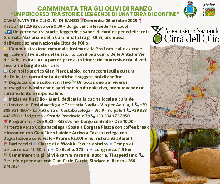 L’amministrazione comunale, insieme alla Pro Loco e alle aziende agricole e vitivinicole del territorio, con il patrocinio delle Antiche Vie del Sale, invita tutti a partecipare a un itinerario immersivo tra uliveti secolari e borgate storiche.