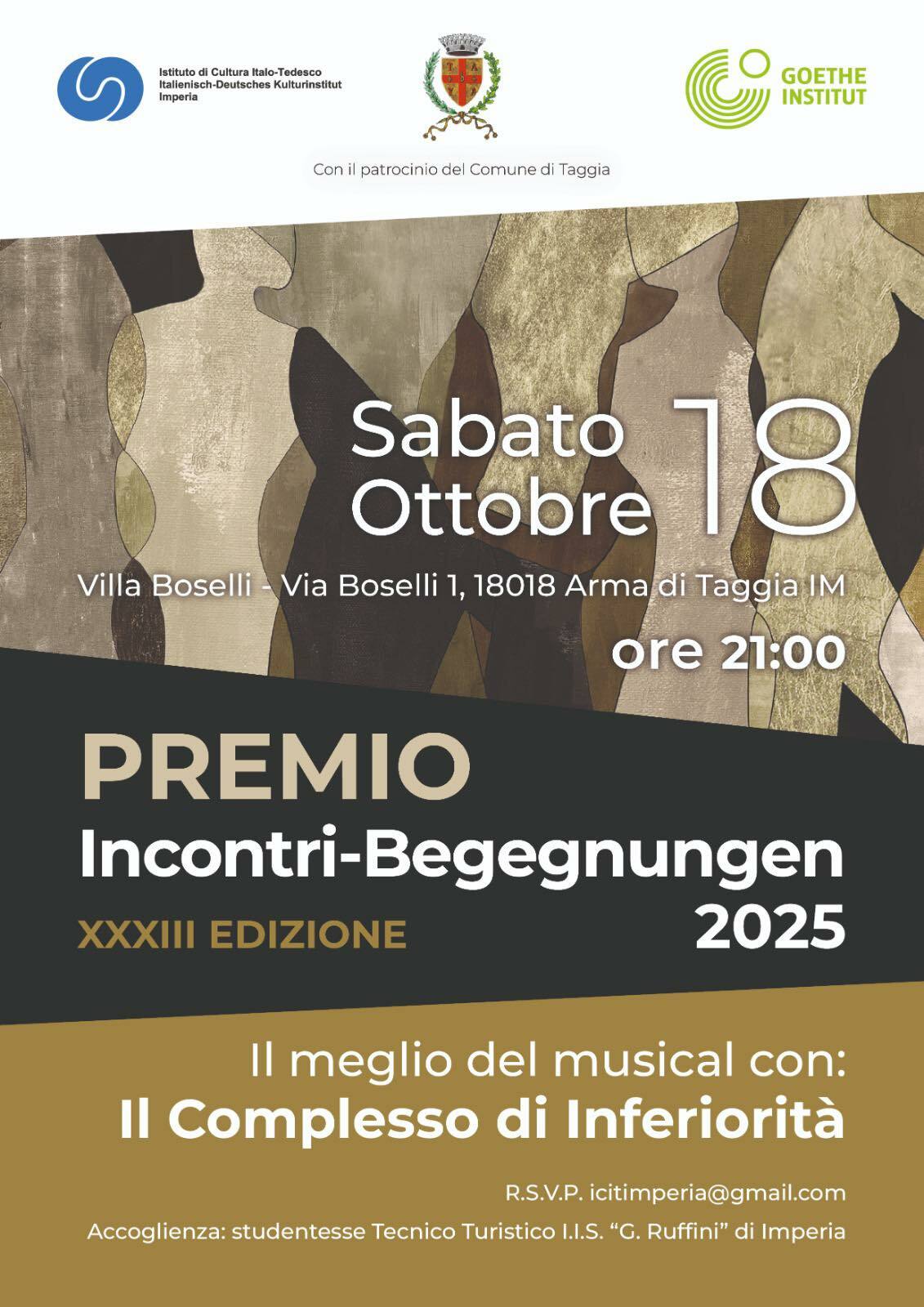 Torna la XXXIII edizione del prestigioso Premio Incontri–Begegnungen, organizzato dall’Istituto di Cultura Italo-Tedesco di Imperia, in collaborazione con il Goethe Institut e con il patrocinio del Comune di Taggia 🇮🇹🇩🇪