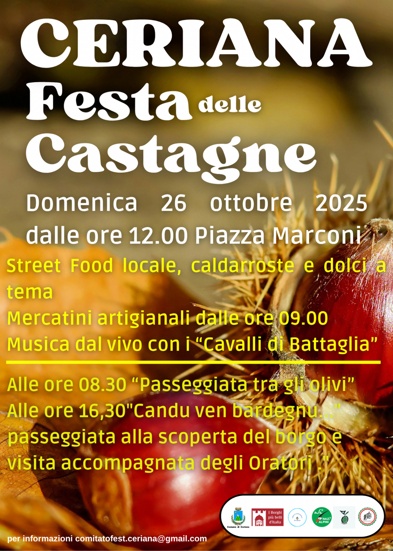 Appuntamento a Ceriana domenica 26 ottobre per la "Festa de Rustìe", la Festa della Castagna, appuntamento che si rinnova ogni anno organizzato dal Comune di Ceriana dal Comitato Festeggiamenti per Ceriana e dal gruppo Alpini di Ceriana.