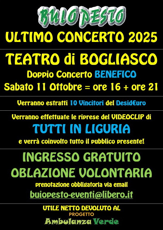 Il prossimo ed ultimo concerto dei BUIO PESTO si terrà a BOGLIASCO (GE), presso il TEATRO di BOGLIASCO Sabato 11 Ottobre e sarà DOPPIO: il medesimo concerto si terrà alle ore 16 e poi alle ore 21.