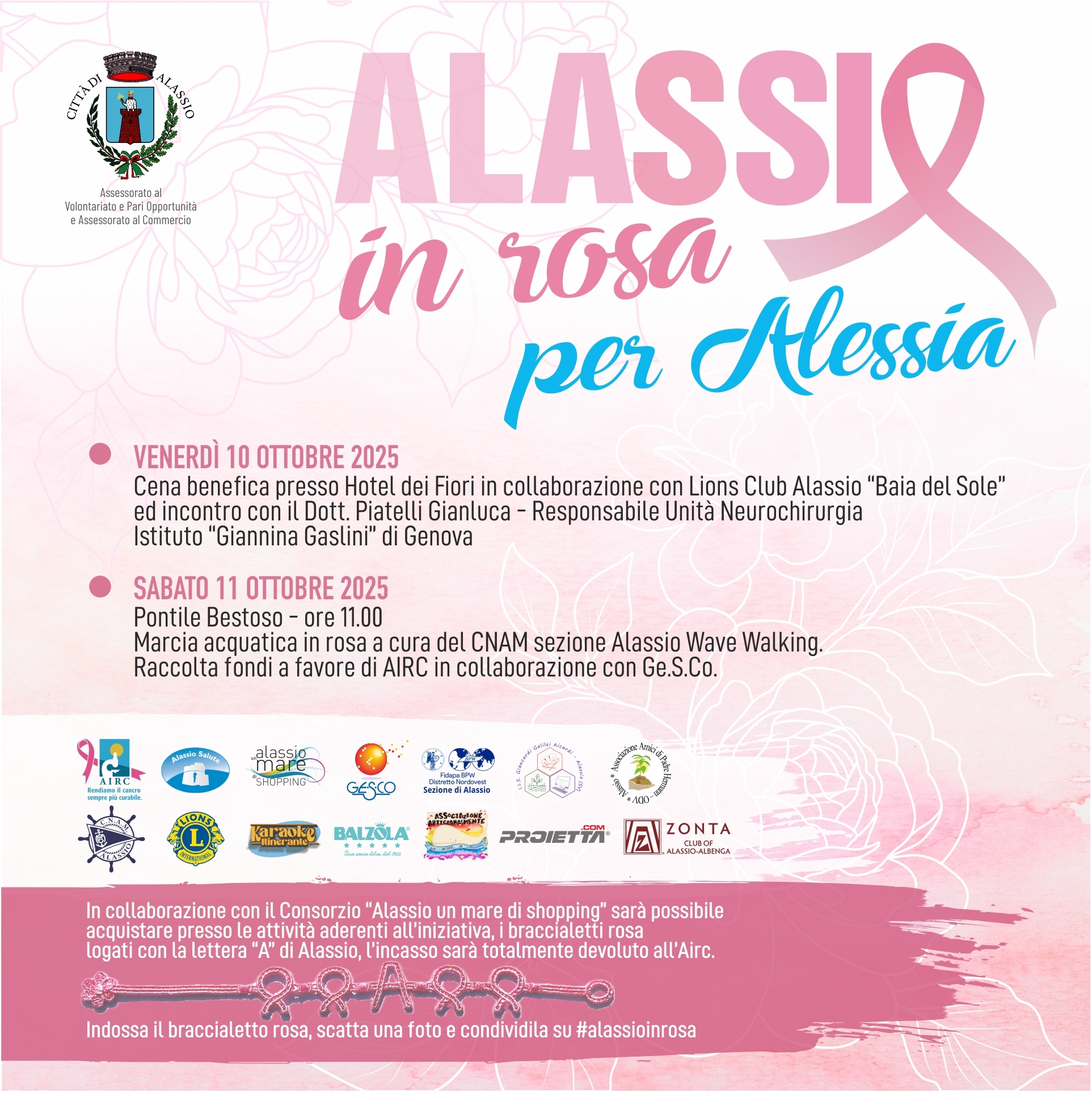Prosegue con entusiasmo “Alassio in Rosa per Alessia” , la manifestazione promossa dall'Assessorato al Volontariato del Comune di Alassio in collaborazione con l’Assessorato al Commercio, AIRC, la Consigliera alle Pari Opportunità Cinzia Salerno, la società partecipata Gesco e numerose realtà del territorio.