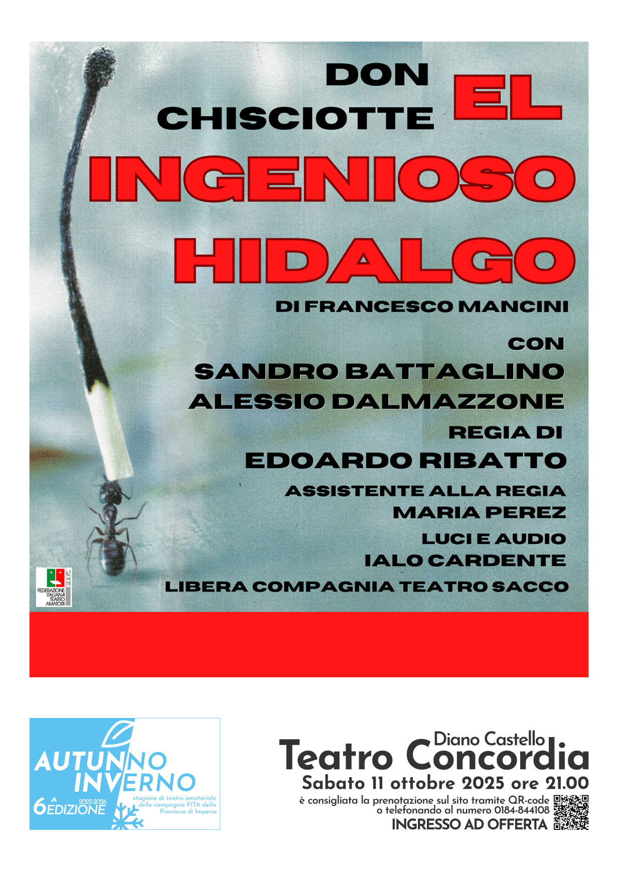 A dare il via alla stagione, sabato 11 ottobre alle 21, sarà la Libera Compagnia Teatro Sacco di Savona con la commedia "Don Chisciotte el ingenioso Hidalgo", scritta da Francesco Mancini e diretta da Edoardo Ribatto. 🎭✨