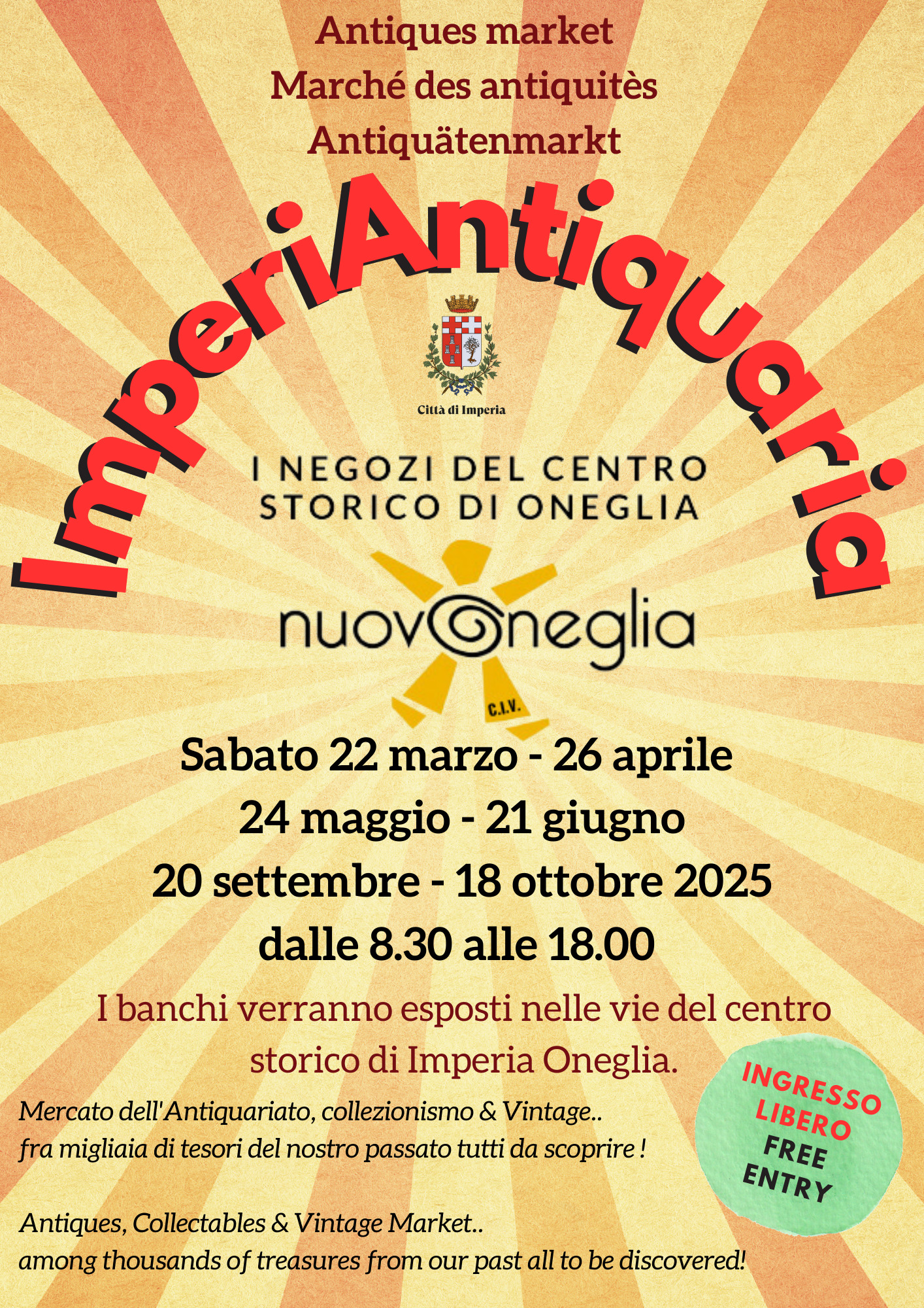 Imperia ritorna con il Mercatino dell’Arte e dell’Antiquariato sabato 18 ottobre 2025, grazie ai commercianti del centro storico Civ NuovOneglia che da tempo ormai organizzano questo evento e grazie alla collaborazione con il Comune di Imperia.