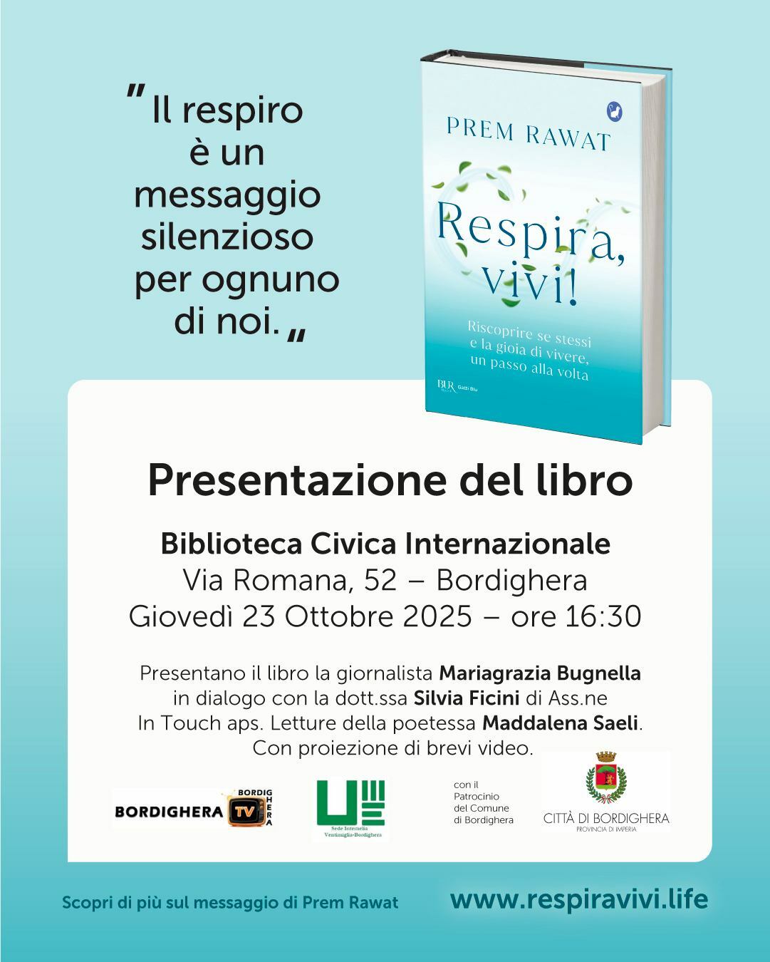 Nuovo appuntamento alla Biblioteca Civica Internazionale di Bordighera: giovedì 23 ottobre 2025, alle 16.30, verrà presentato il libro "Respira, vivi!" di Prem Rawat. Al centro dell’opera l’invito, rivolto ai lettori, a connettersi con il potere racchiuso nel respiro, spesso sottovalutato, ricordando che è condiviso dall’intera umanità.