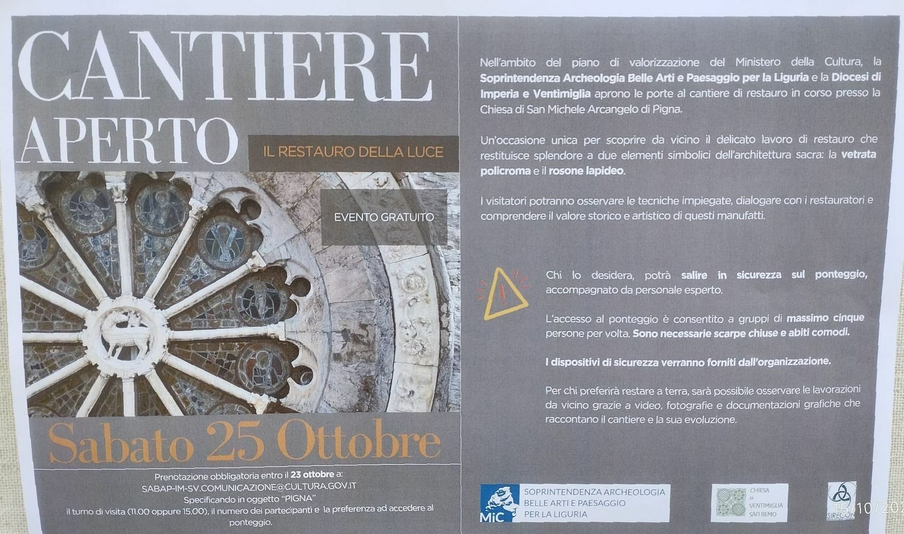 Nell'ambito del piano di valorizzazione del Ministero della Cultura, la Soprintendenza Archeologia Belle Arti e Paesaggio per la Liguria e la Diocesi di Imperia e Ventimiglia aprono le porte al cantiere di restauro in corso presso la Chiesa di San Michele Arcangelo di Pigna.
