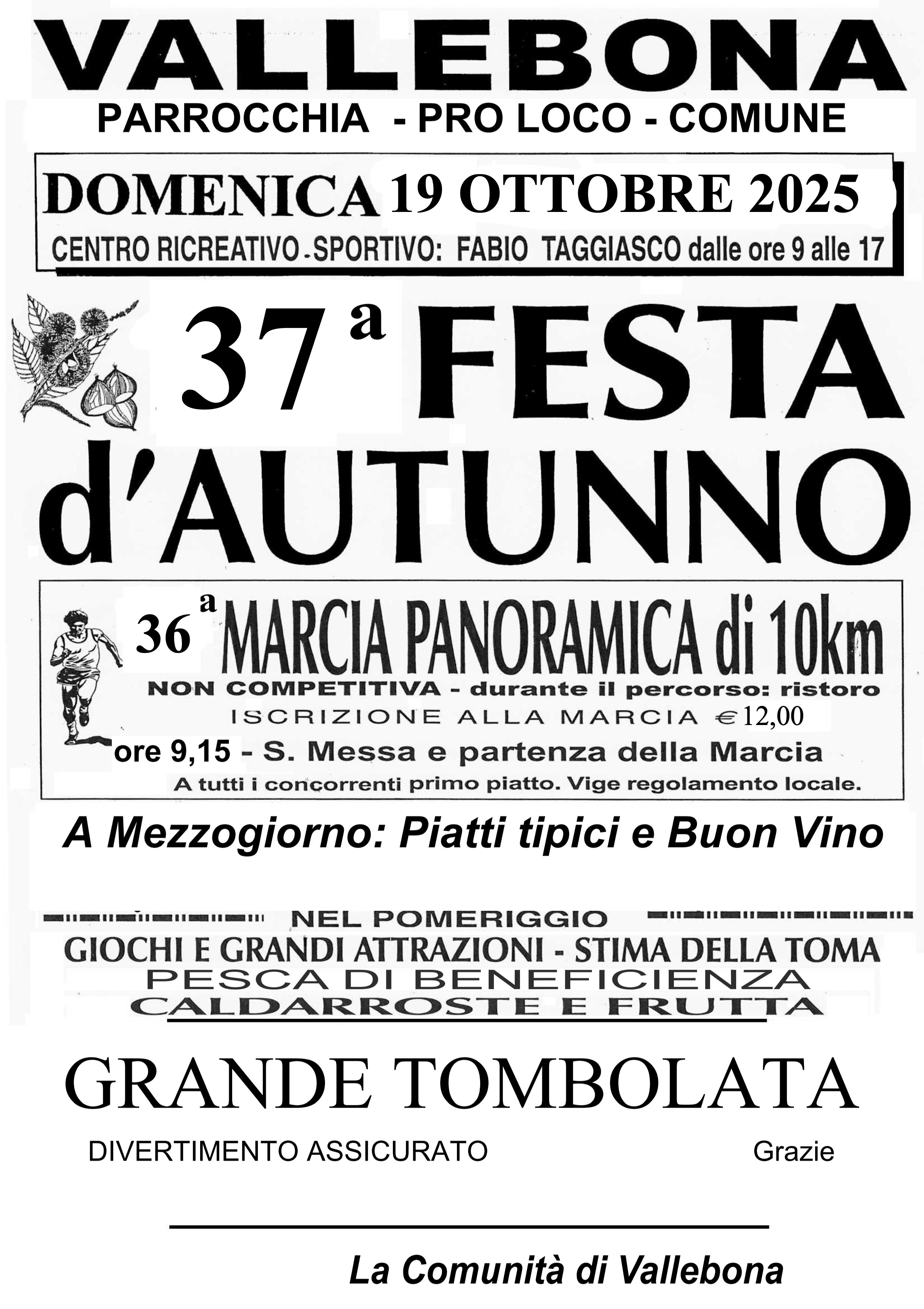 • Nel pomeriggio – Giochi, grandi attrazioni, stima della toma, pesca di beneficenza, caldarroste e frutta.