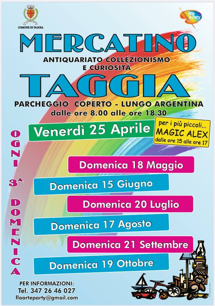 Domenica 21 settembre appuntamento a Taggia parcheggio coperto, con il mercatino del collezionismo e piccolo antiquariato. dalle ore 8.00 alle ore 18,30 con la collaborazione di Modesto Allaria e Patrizia Bertani.