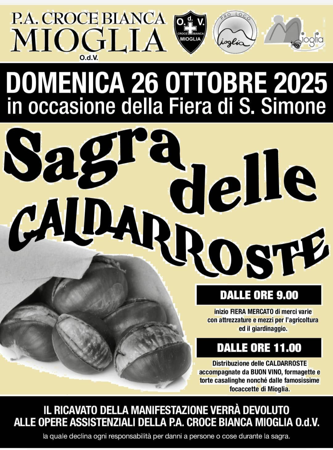 IL RICAVATO DELLA MANIFESTAZIONE VERRÀ DEVOLUTO ALLE OPERE ASSISTENZIALI DELLA P.A. CROCE BIANCA MIOGLIA o.d.v. la quale declina ogni responsabilità per danni a persone o cose durante la sagra.