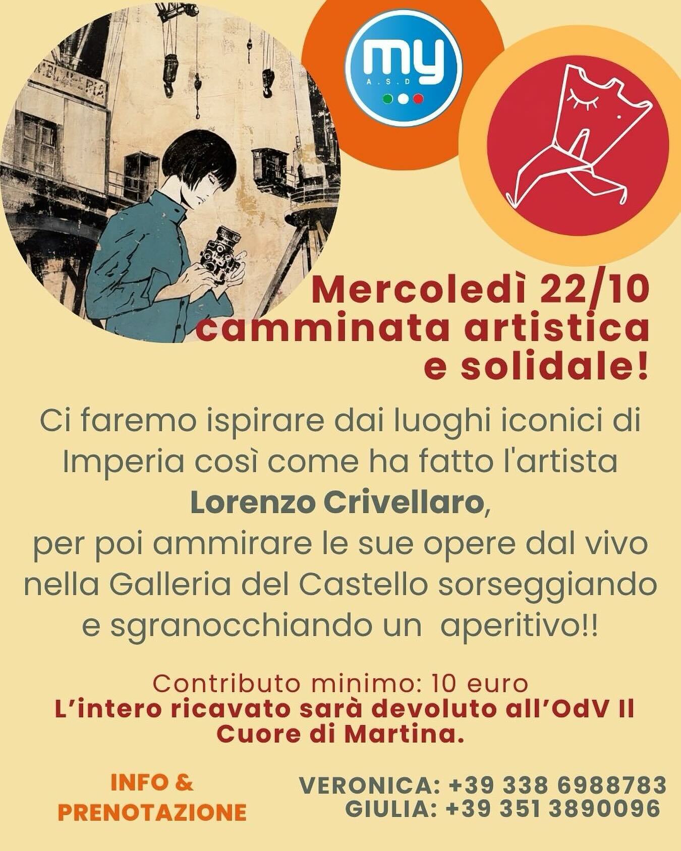 Durante la passeggiata attraverseremo alcuni dei luoghi più iconici di Imperia, gli stessi immortalati dall’artista Lorenzo Crivellaro nelle sue opere. Il percorso si concluderà proprio in Galleria, dove ci attenderà un aperitivo e la possibilità di ammirare le opere dal vivo, in un’atmosfera conviviale e d’ispirazione.