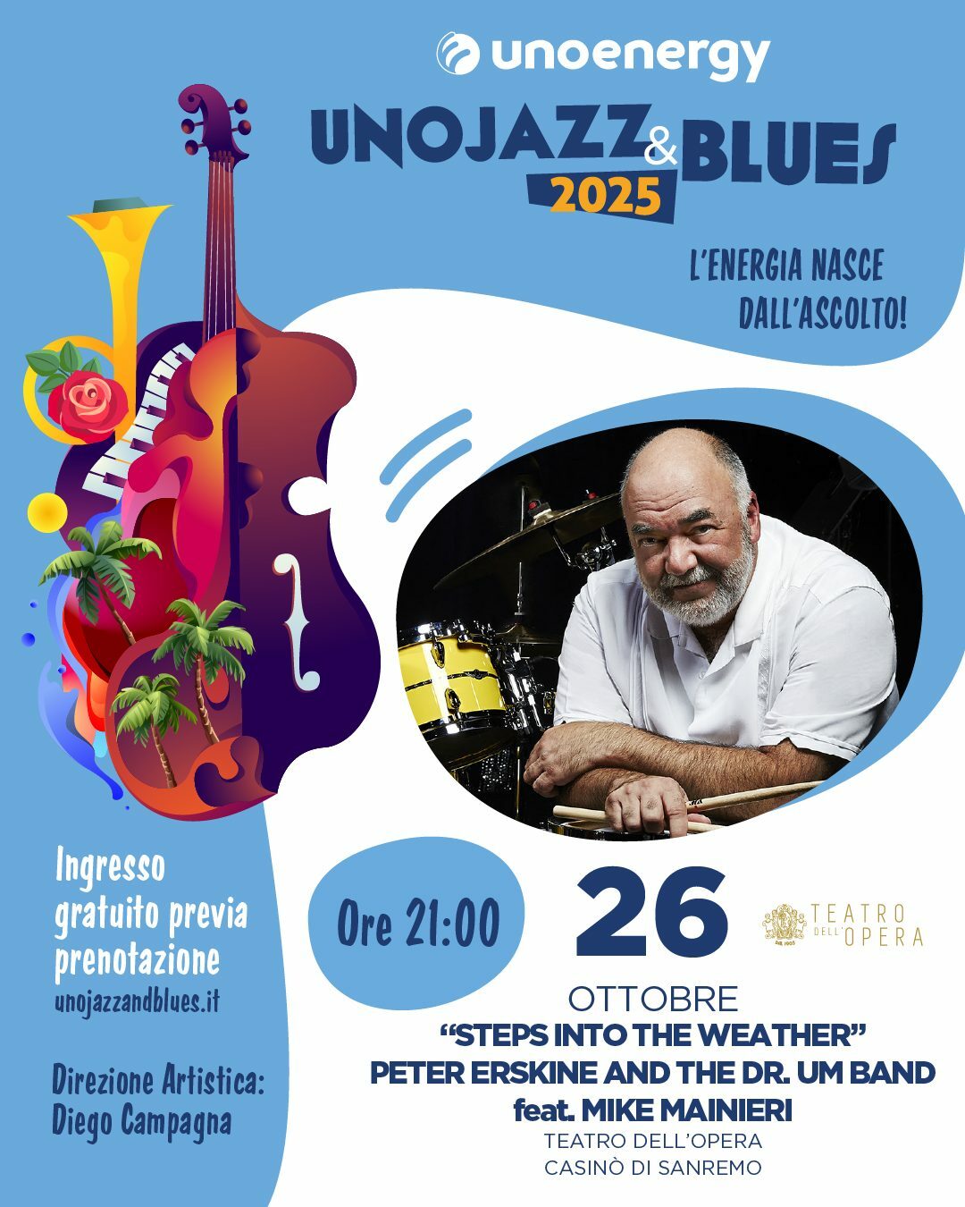 Il 26 ottobre al Teatro dell’Opera del Casinò di Sanremo si chiude la rassegna con un concerto straordinario: Peter Erskine and the Dr. Um Band featuring Mike Mainieri.