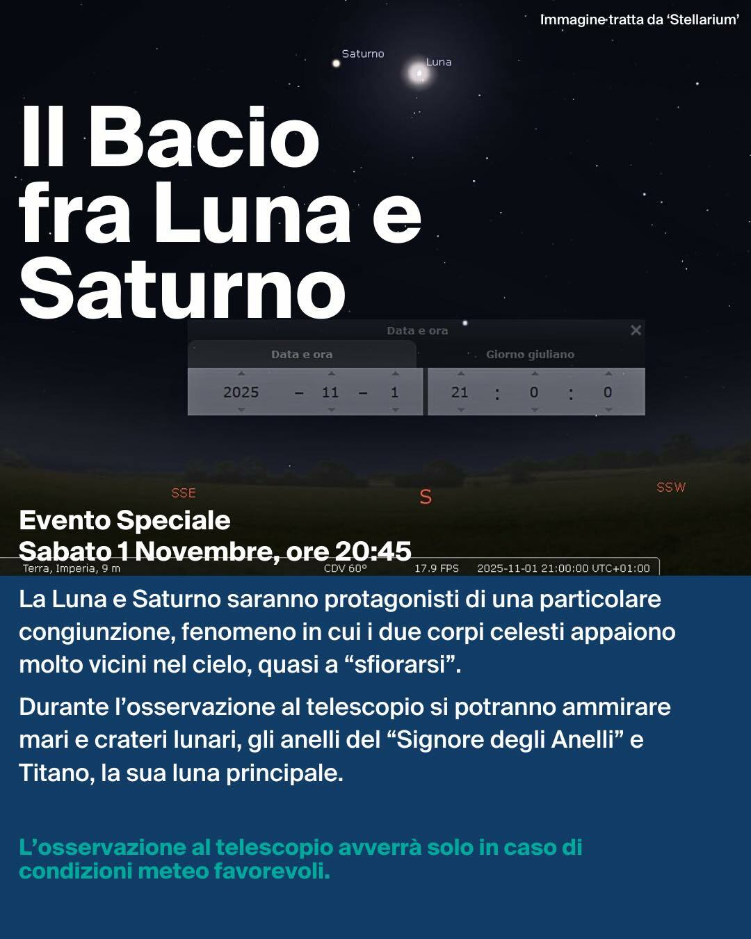 La Luna e Saturno saranno protagonisti di una particolare congiunzione, fenomeno in cui i due corpi celesti appaiono molto vicini nel cielo, quasi a “sfiorarsi”.
