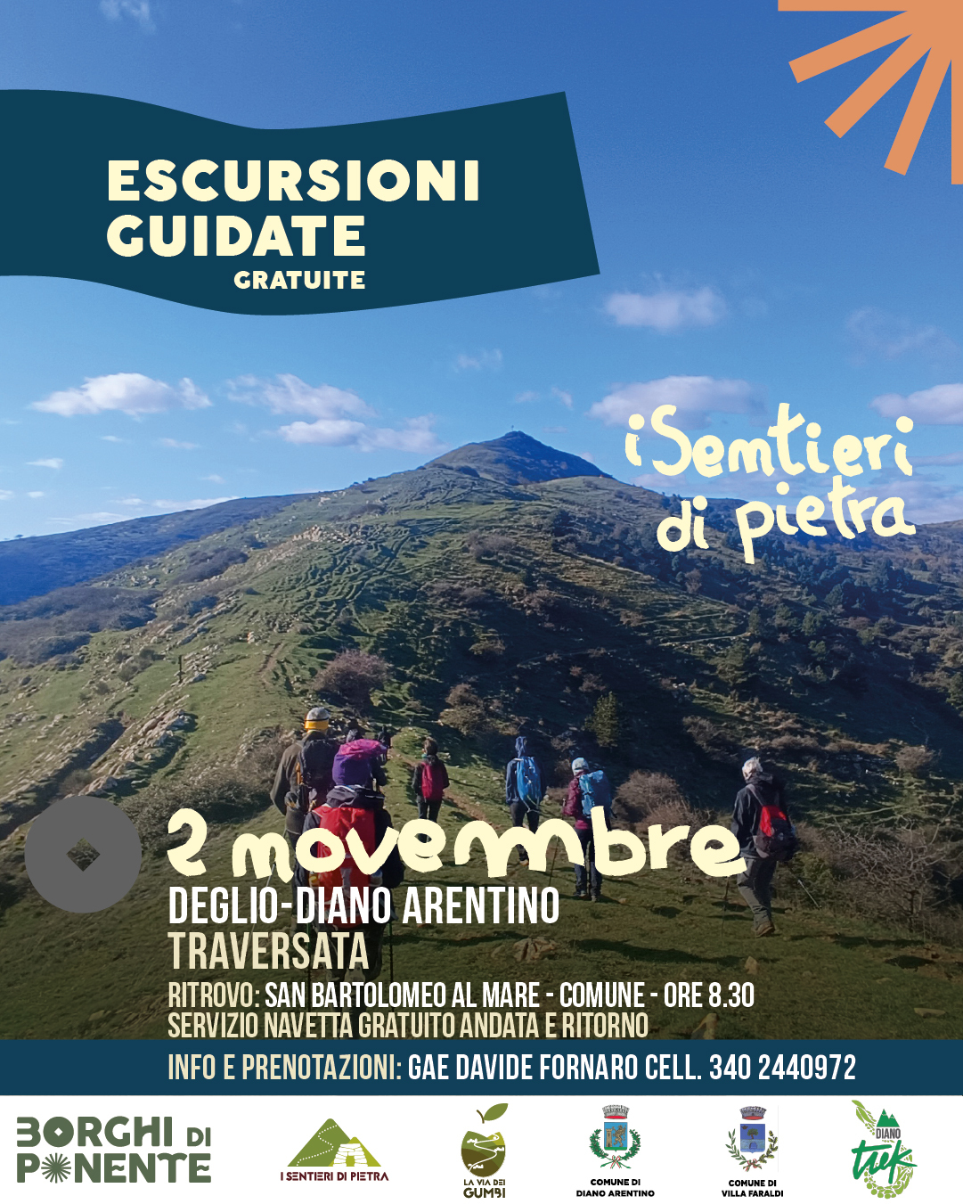 🕑 L’appuntamento è per domenica 2 novembre, ci incontreremo alle 8,30 a San Bartolomeo al Mare dove la navetta ci prenderà per portarci a Deglio Faraldi, dove inizierà la nostra camminata verso Diano Arentino.