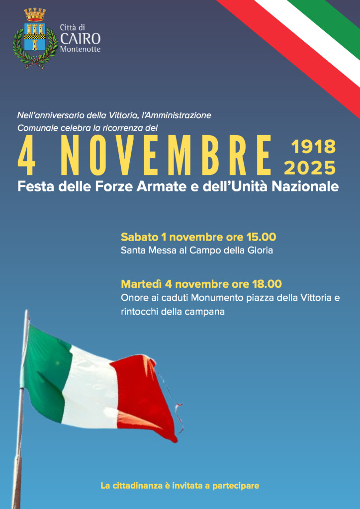 Nell’anniversario della Vittoria, l’Amministrazione Comunale celebra la ricorrenza del 4 NOVEMBRE 1918 2025 Festa delle Forze Armate e dell’Unità Nazionale