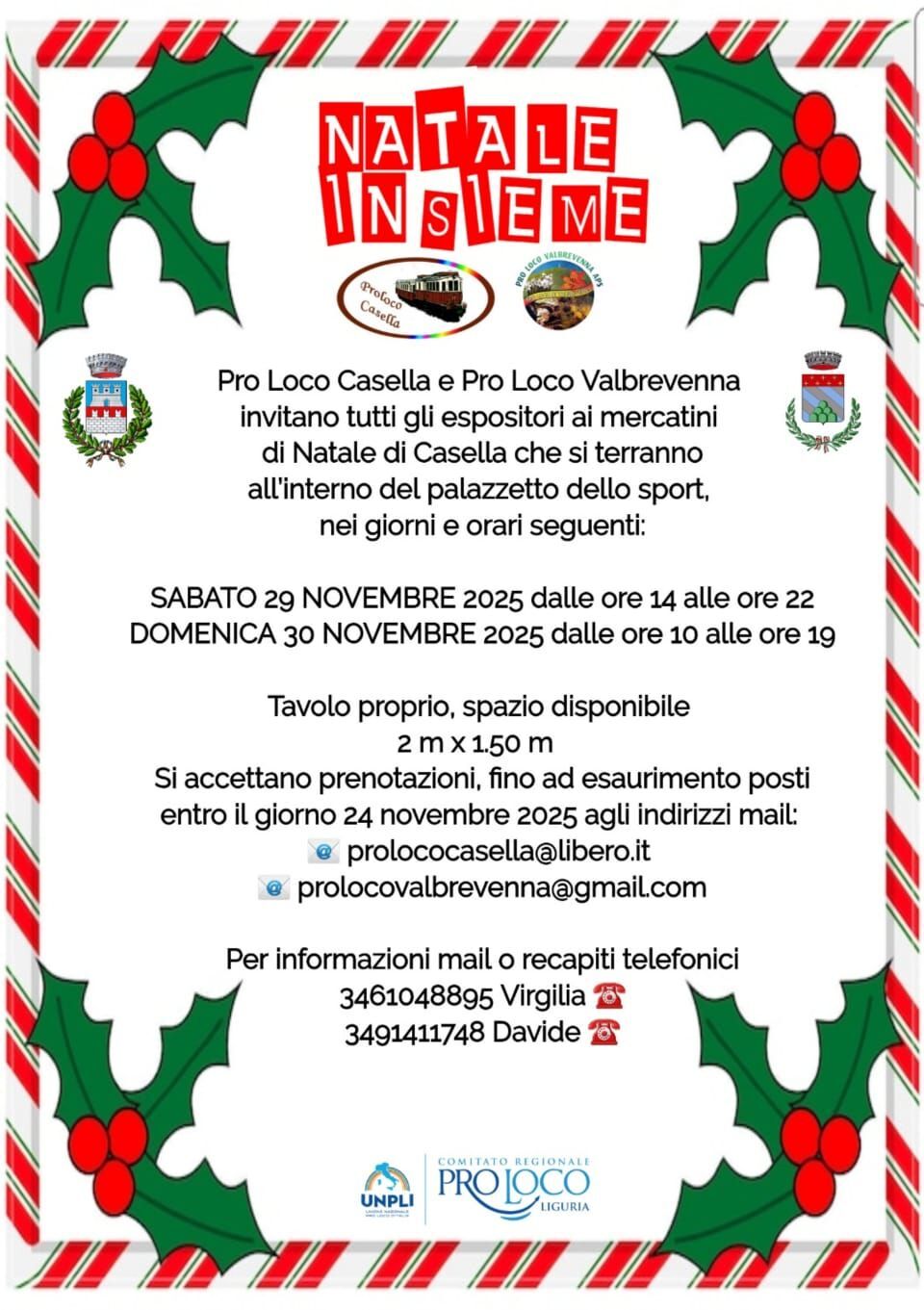 Pro Loco Casella e Pro Loco Valbrevenna invitano tutti gli espositori ai mercatini di Natale di Casella che si terranno all'interno del palazzetto dello sport, nei giorni e orari seguenti: