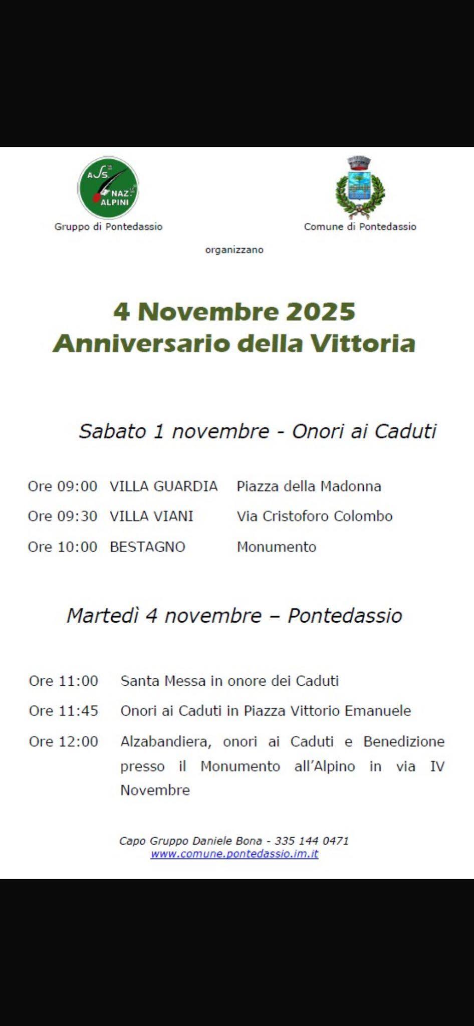 Ore 12:00 Alzabandiera, onori ai Caduti e Benedizione presso il Monumento all'Alpino in via IV Novembre