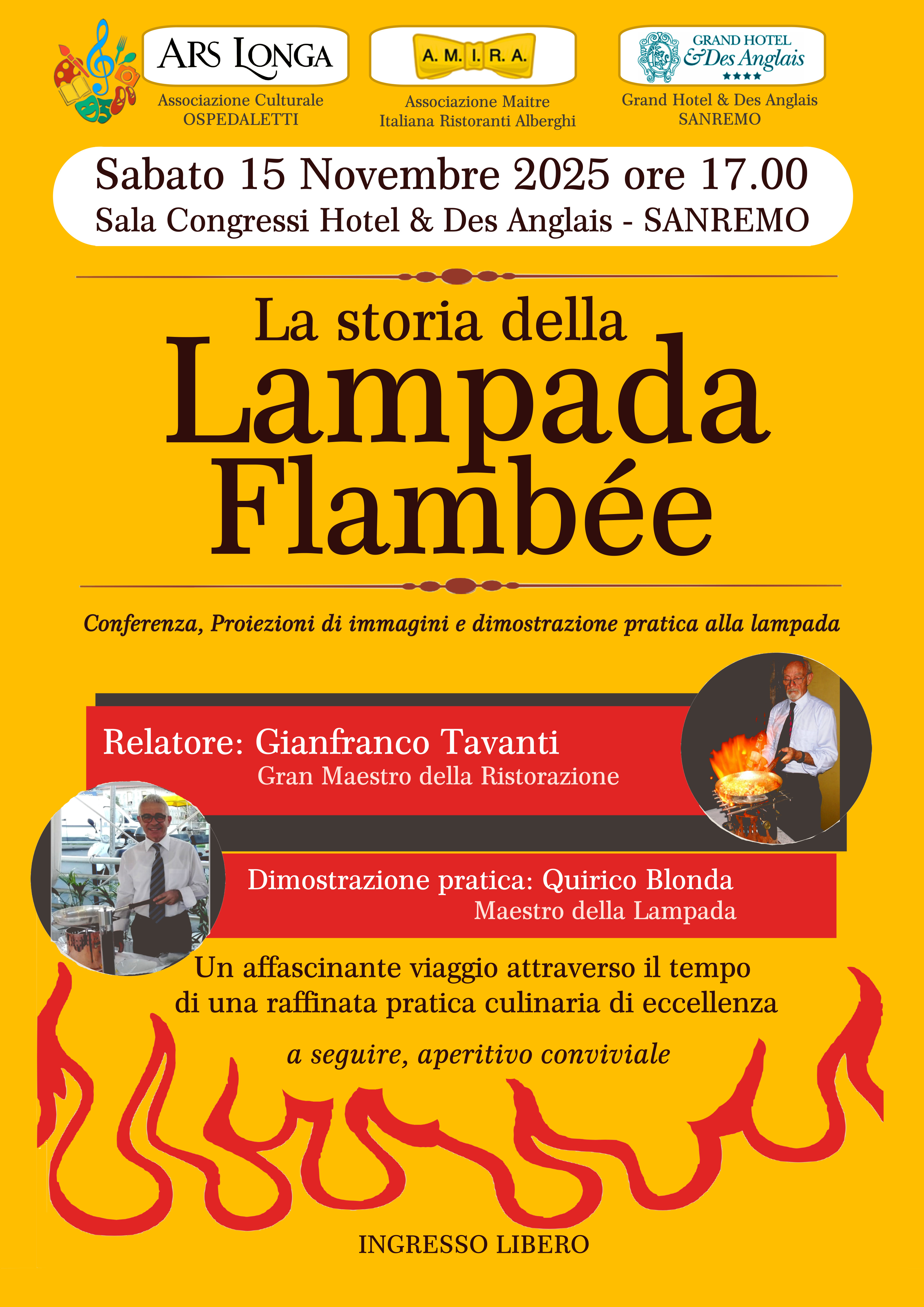 Sabato 15 Novembre, p.v, alle ore 17.00, nella sala congressi del Grand Hotel & Des Anglais di Sanremo, organizzato dall'Associazione Culturale ARS LONGA di Ospedaletti, con il patrocinio dell'AMIRA Associazione Maitres Italiana Ristoranti Alberghi, si terrà una conferenzacome tema "La storia della lampada flambée" . Relatore Gianfranco Tavanti "Gran Maestro della Ristorazione". Seguirà una dimostrazione pratica da parte del "Maestro della Lampada" Quirico Blonda ed un aperitivo per chi volesse condividere un momento di convivialitá.