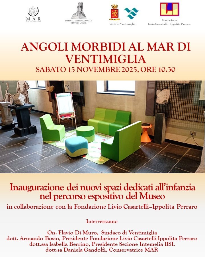 Sabato 15 novembre alle ore 10.30, alla presenza del Sindaco della Città di Ventimiglia On. Flavio Di Muro, del Presidente della Fondazione “Livio Casartelli-Ippolita Perraro” dott. Armando Bosio, della Presidente della Sezione Intemelia dell'IISL dott.ssa Isabella Berrino e della Coservatrice del MAR dott.ssa Daniela Gandolfi, verranno presentati al pubblico gli “Angoli morbidi” realizzati all'interno del percorso espositivo del Museo, grazie al contributo economico della Fondazione “Livio Casartelli-Ippolita Perrraro”. Formati da tre postazioni destinate ai visitatori più piccoli, i bimbi della prima infanzia e della scuola primaria, sono composte da divanetti, sgabelli, tavolini, piccole librerie, tappeti antitrauma, realizzati in materiali colorati e accattivanti e costituiranno delle oasi dedicate alla prima infanzia che potrà trovare nel Museo occasione di gioco e apprendimento, in dialogo con i reperti esposti (ceramiche, lapidi, statue, vetri, etc.), testimonianza degli antichi abitanti della città di Albintimilium. Un ulteriore traguardo per il Museo Rossi da sempre particolarmente attento alla formazione delle giovani generazioni e alle attività ludico-didattiche.