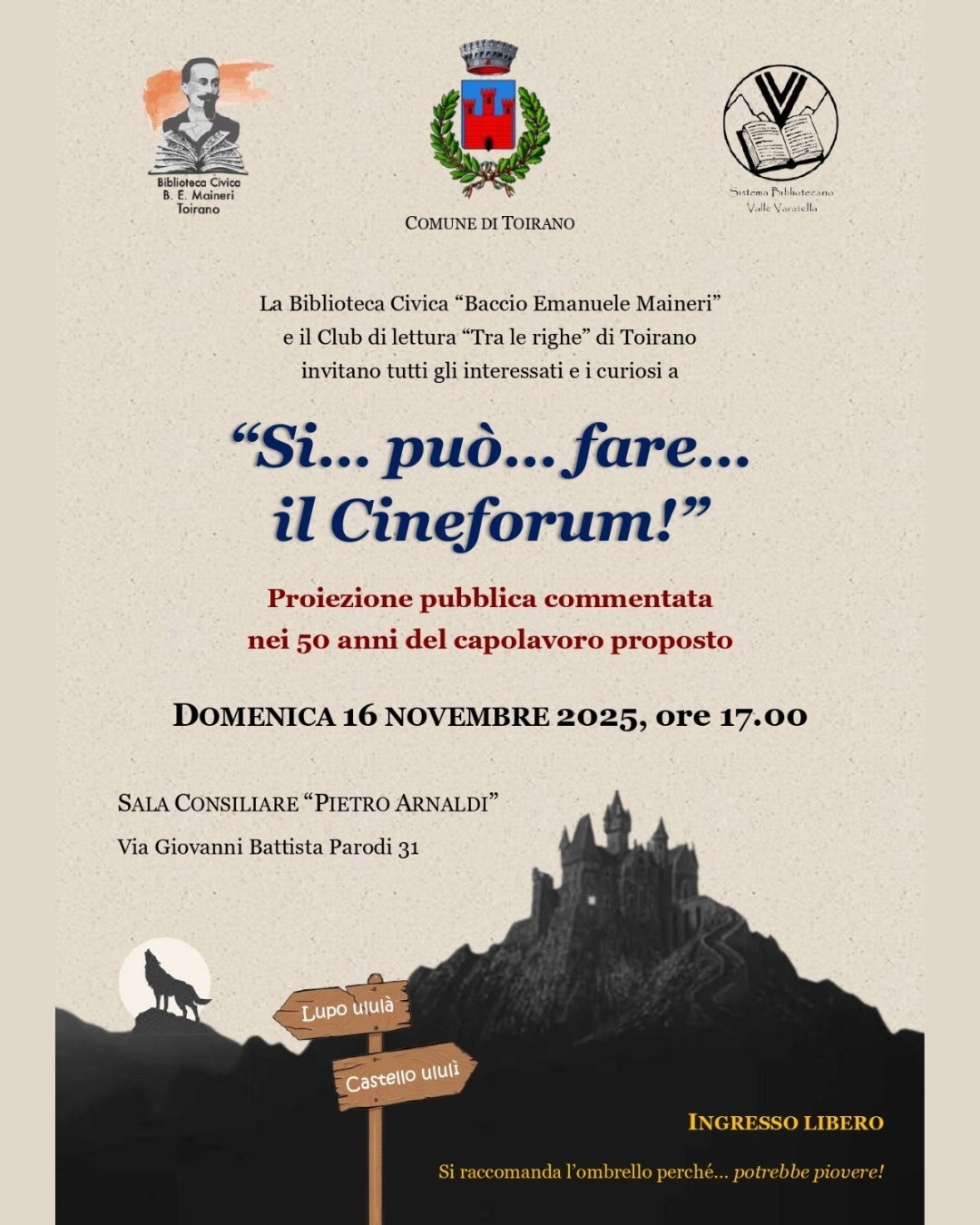 📽️ La Biblioteca Civica “Baccio Emanuele Mainieri” e il Club di lettura “Tra le righe” di Toirano invitano tutti gli appassionati di cinema e curiosi a una proiezione pubblica commentata in occasione dei 50 anni di un grande capolavoro del cinema!