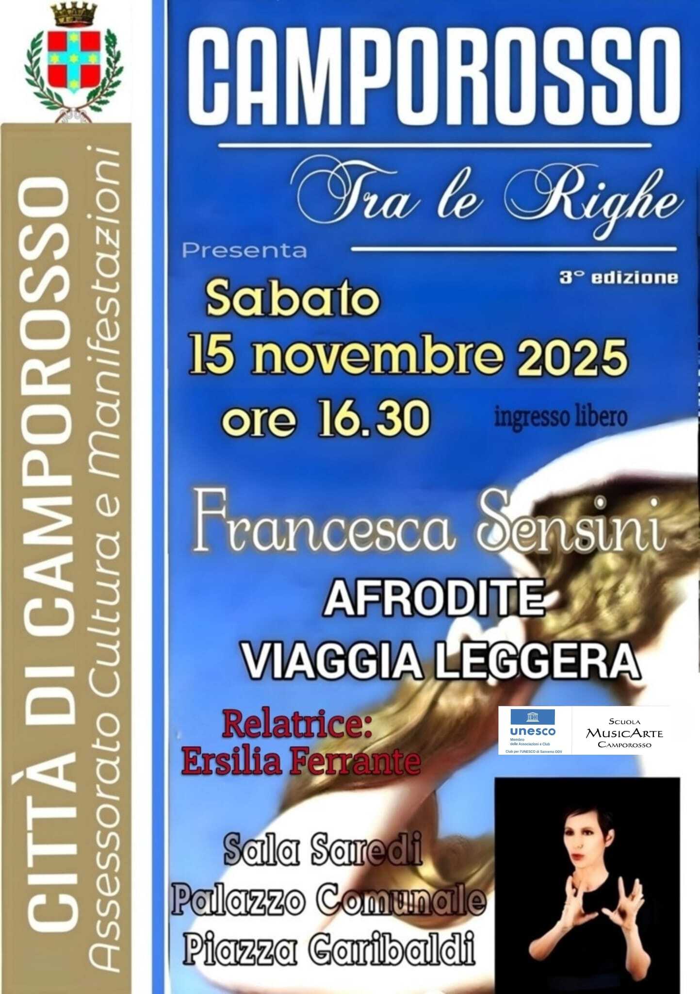 Rassegna autunnale dedicata alla presentazione di opere letterarie di autori locali “Camporosso tra le righe” presso la sala “Mario Saredi” del Comune di Camporosso: il secondo incontro si svolgerà sabato 15 novembre alle 16.30 con la presentazione del libro di Francesca Sensini intitolato “Afrodite viaggia leggera” 🎶