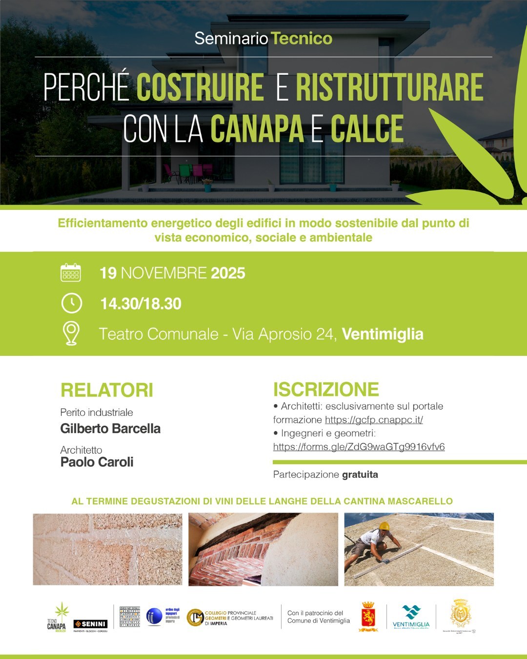 Il Comune di Ventimiglia presenta il Seminario Tecnico “Perché costruire e ristrutturare con la canapa e calce”: un appuntamento per capire come rendere la nostra edilizia più sostenibile, efficiente e innovativa.