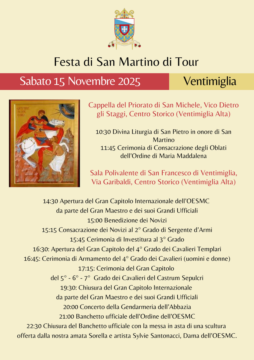 19:30 Chiusura del Gran Capitolo Internazionale da parte del Gran Maestro e dei suoi Grandi Ufficiali
