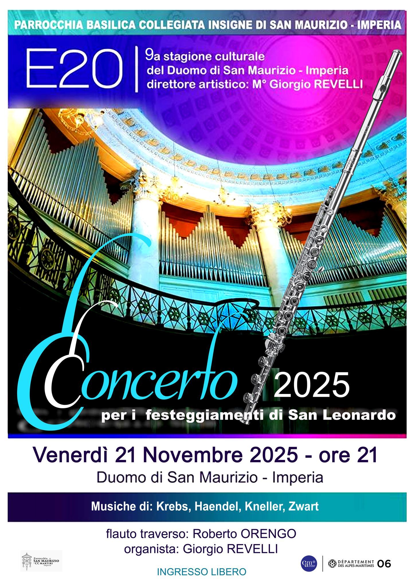 La serata prevede un concerto con flauto traverso (M° Roberto Orengo) ed organo (M° Giorgio Revelli).