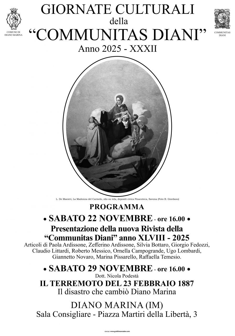 • SABATO 22 NOVEMBRE - ore 16.00 • Presentazione della nuova Rivista della "Communitas Diani" anno XLVIII - 2025 Articoli di Paola Ardissone, Zeffirino Ardisone, Silvia Bottaro, Giorgio Fedozzi, Claudio Littiardi, Roberto Messico, Ornella Campogrande, Ugo Lombardi, Giannetto Novaro, Marina Pissarello, Raffaella Temesio.