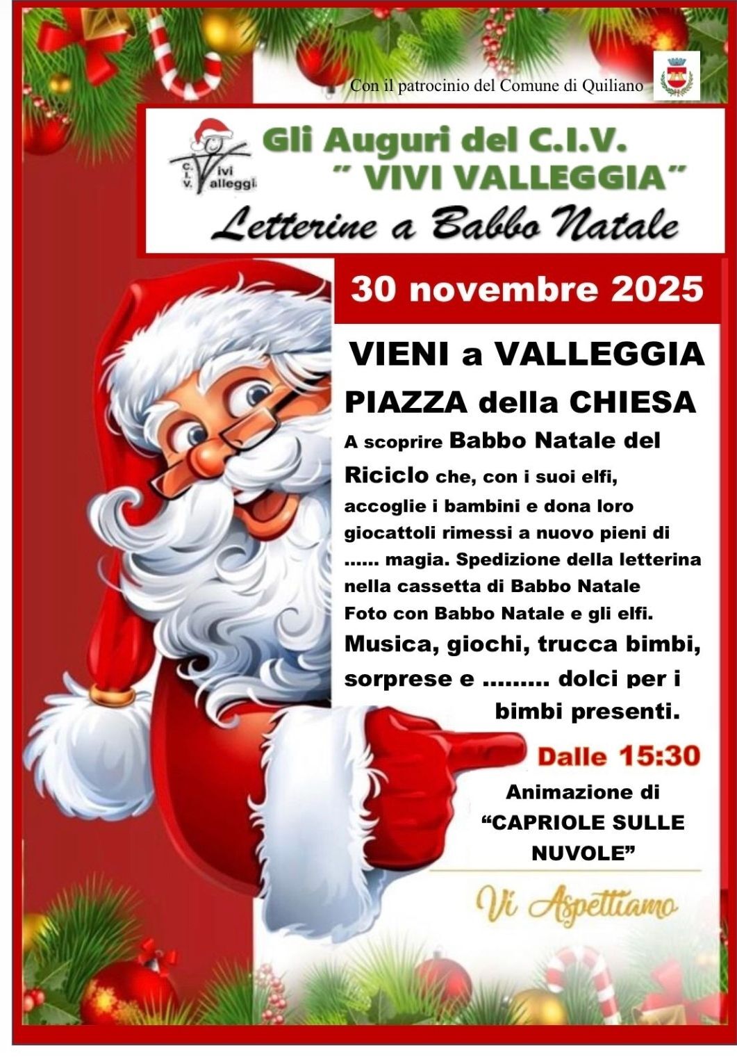 A scoprire Babbo Natale del Riciclo che, con i suoi elfi, accoglie i bambini e dona loro giocattoli rimessi a nuovo pieni di ...... magia. Spedizione della letterina nella cassetta di Babbo Natale Foto con Babbo Natale e gli elfi. Musica, giochi, trucca bimbi, sorprese e ........ dolci per i bimbi presenti.