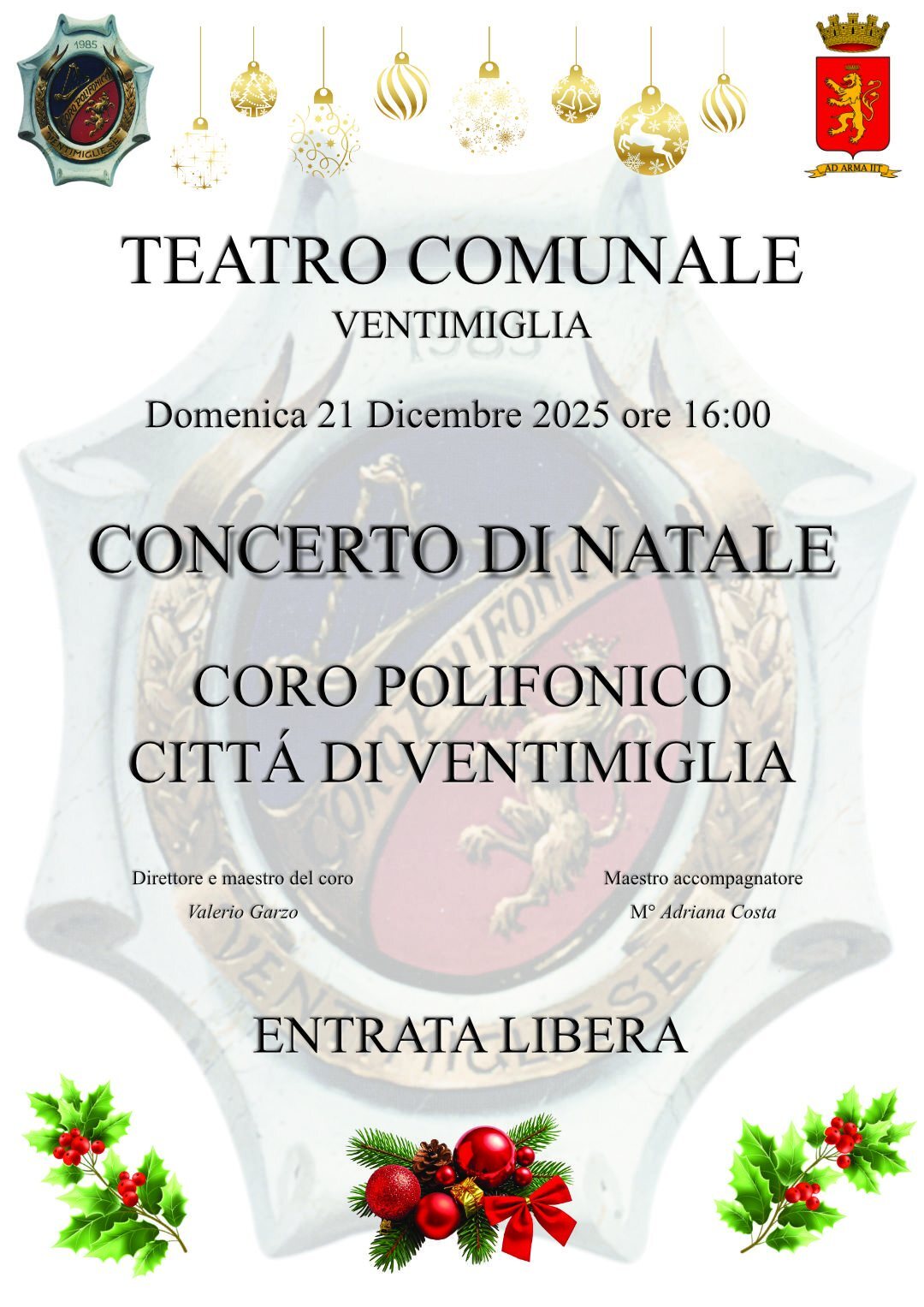 Concerto di Natale del Coro Polifonico Città di Ventimiglia presso Teatro Comunale Di Ventimiglia alle ore 16.00 del 21 dicembre.
