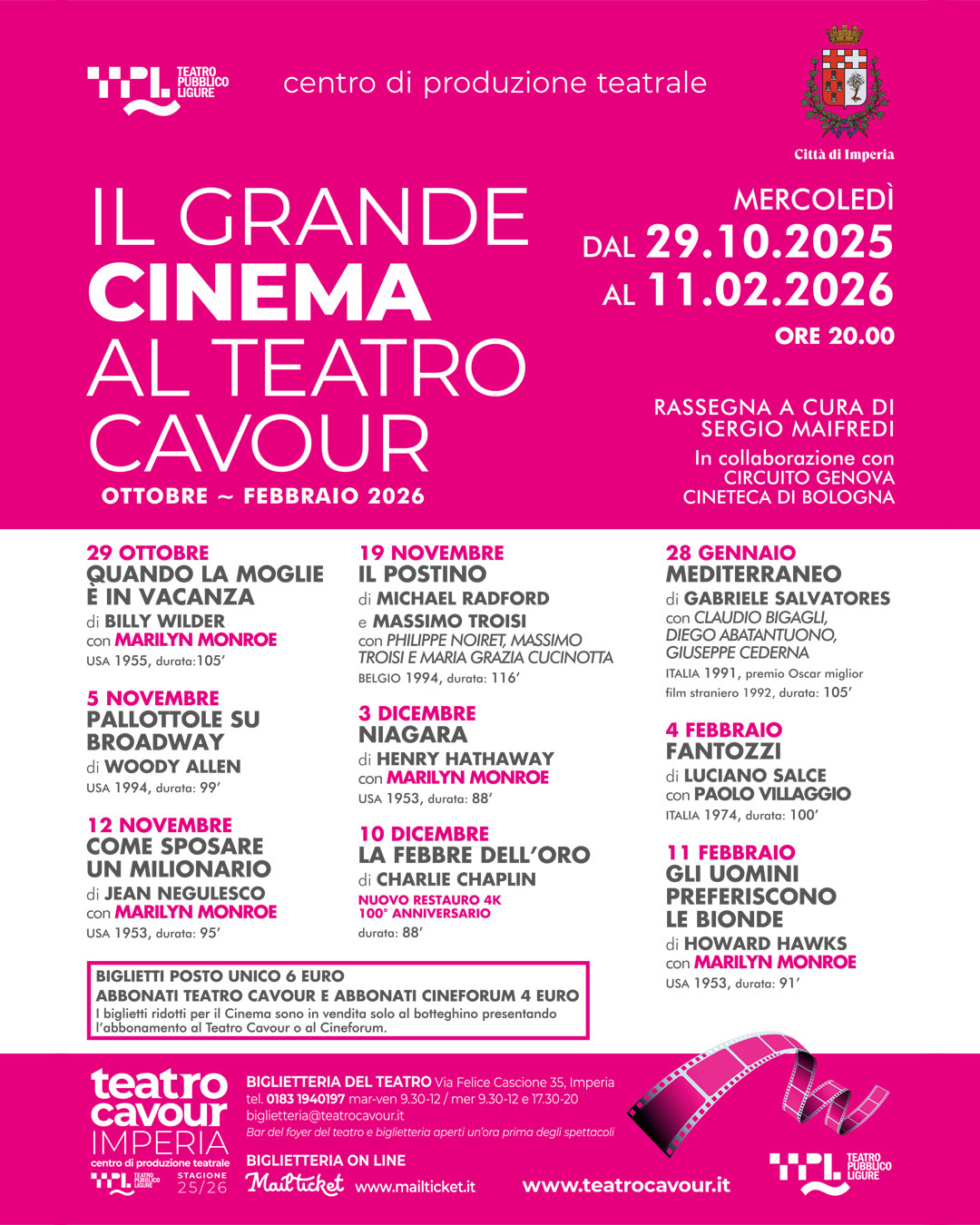 Il grande schermo torna a illuminare il Teatro Cavour con una rassegna che celebra i capolavori della storia del cinema — da Marilyn Monroe a Massimo Troisi, da Charlie Chaplin a Paolo Villaggio.