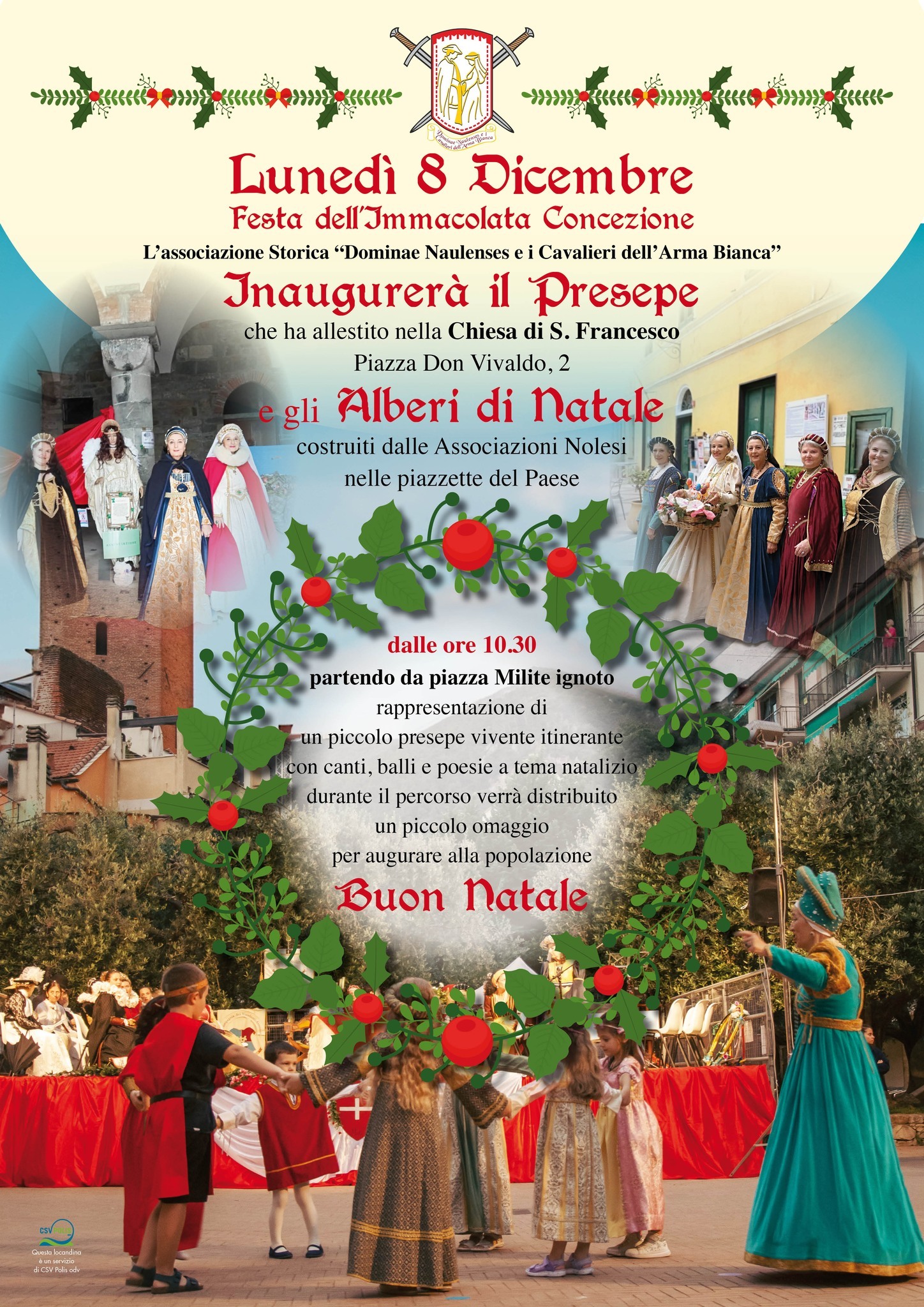 Inaugurerà il Presepe che ha allestito nella Chiesa di S. Francesco Piazza Don Vivaldo, 2 e gli Alberi di Natale costruiti dalle Associazioni Nolesi nelle piazzette del Paese