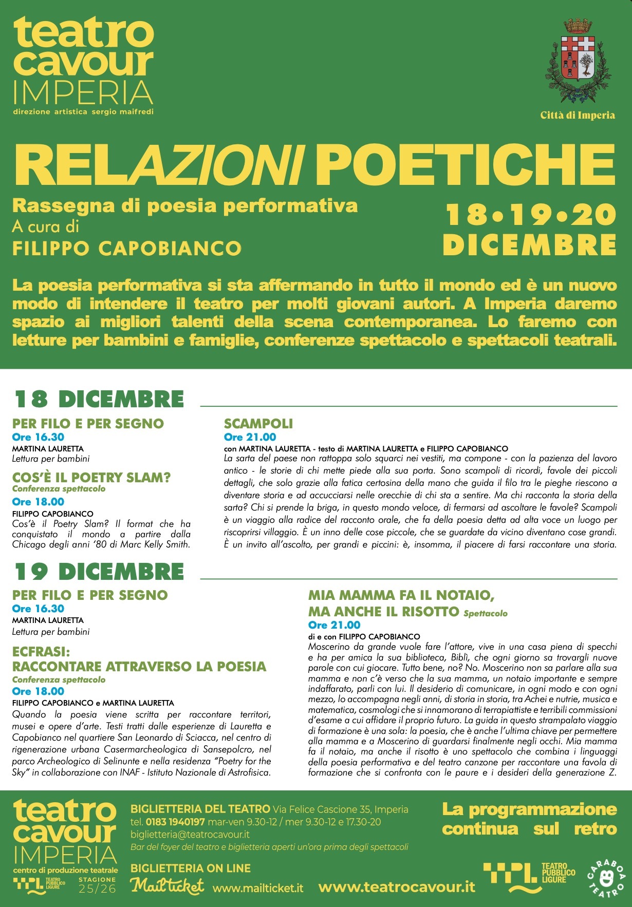 La poesia performativa si sta affermando in tutto il mondo ed è un nuovo modo di intendere il teatro per molti giovani autori. A Imperia daremo spazio ai migliori talenti della scena contemporanea. Lo faremo con letture per bambini e famiglie, conferenze spettacolo e spettacoli teatrali.