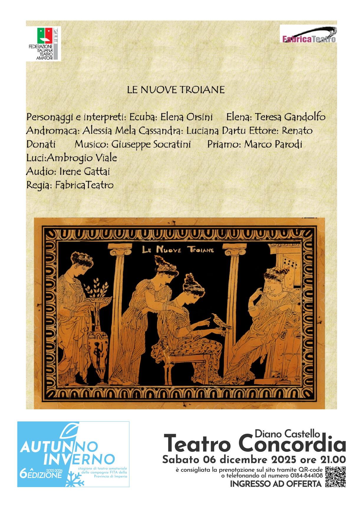 Personaggi e interpreti: Ecuba: Elena Orsini Elena: Teresa Gandolfo Andromaca: Alessia Mela Cassandra: Luciana Dartu Ettore: Renato Donati Musico: Giuseppe Socratini Priamo: Marco Parodi Luci: Ambrogio Viale Audio: Irene Gattai Regia: FabricaTeatro