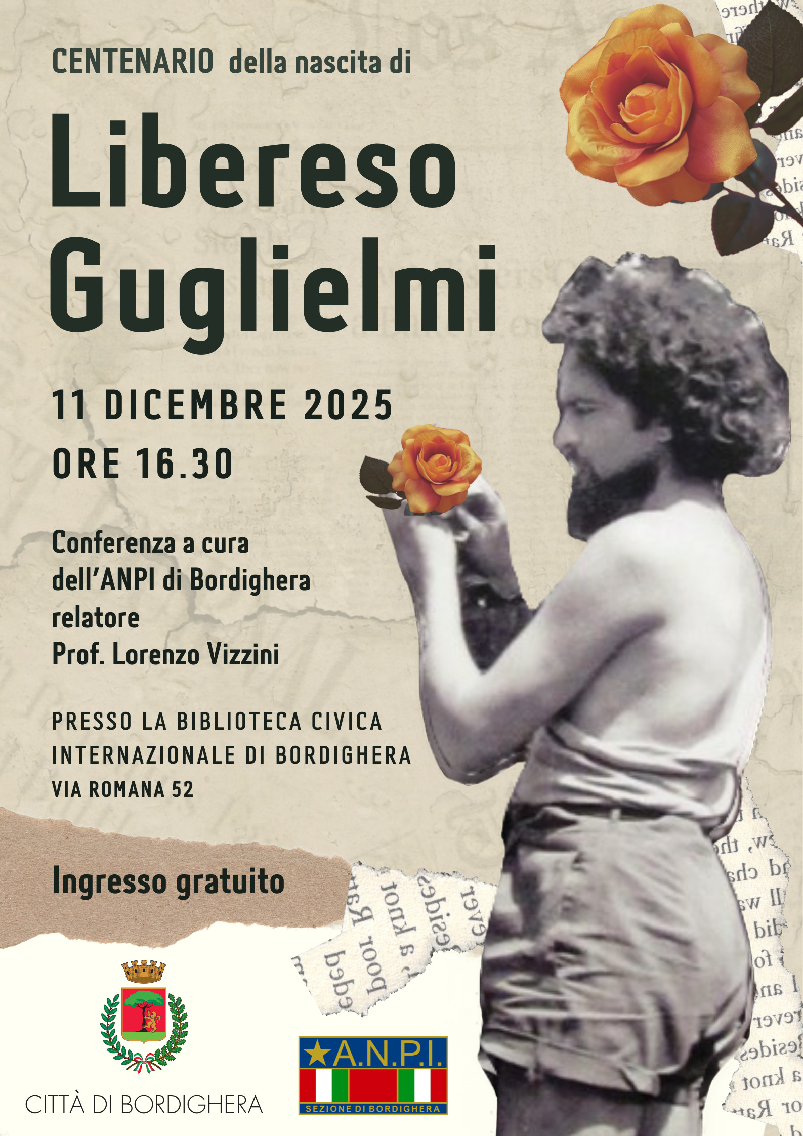 In occasione del centenario della nascita del nostro concittadino Libereso Guglielmi, presso la Biblioteca Civica Internazionale di Bordighera si terrà Giovedi 11 Dicembre 2025 alle ore 16,30 una conferenza del prof. Lorenzo Vizzini su questo illustre personaggio, patrocinata dal Comune di Bordighera e dall'ANPI-sezione di Bordighera-Vallecrosia.