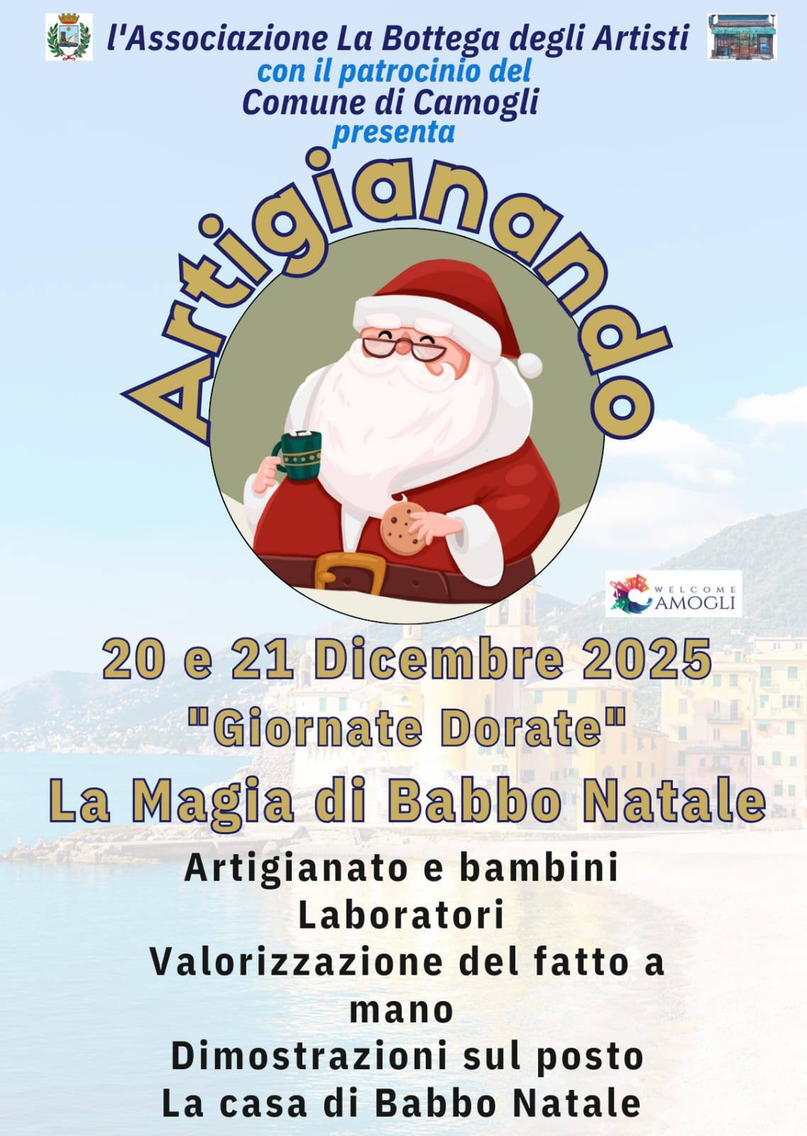 L'Associazione La Bottega degli Artisti con il patrocinio del Comune di Camogli presenta Artigianando 20 e 21 Dicembre 2025 "Giornate Dorate" La Magia di Babbo Natale.