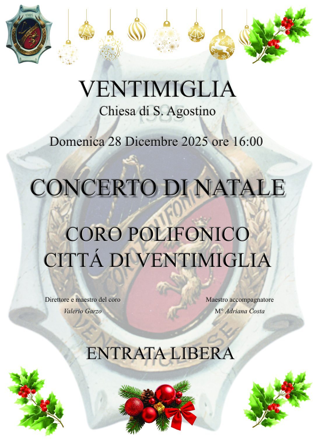 Concerto di Natale del Coro Polifonico Città di Ventimiglia presso la Chiesa Sant'Agostino alle ore 16.00.
