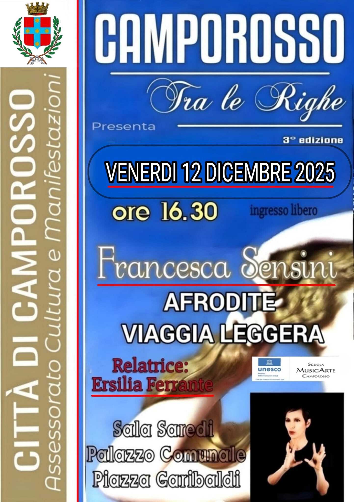 Rassegna autunnale di presentazioni di libri scritti da autori locali “Camporosso tra le righe” presso la sala “Mario Saredi” del Comune di Camporosso: nuovo appuntamento venerdì 12 dicembre alle ore 16.30 con la presentazione del libro di Francesca Sensini dal titolo “Afordite viaggia leggera” – intermezzi musicali a cura della Scuola Musicarte di Camporosso.