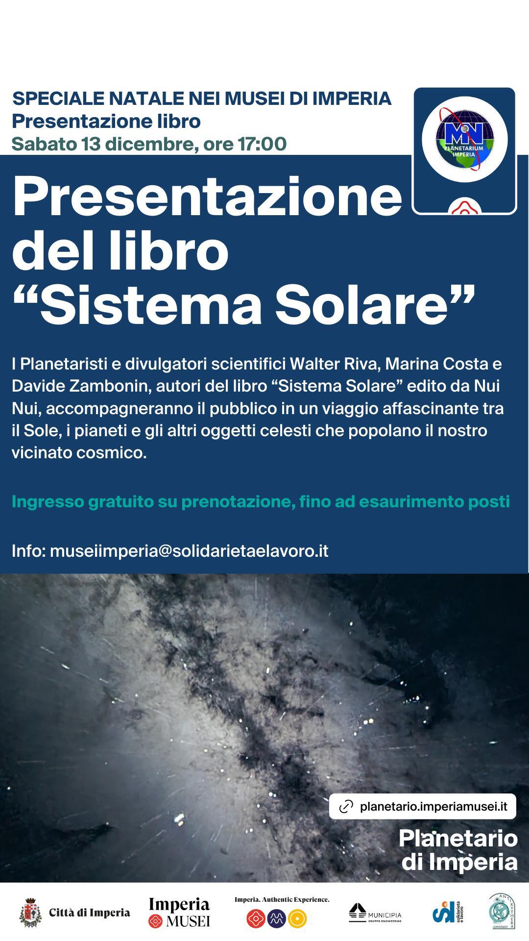 I Planetaristi e divulgatori scientifici Walter Riva, Marina Costa e Davide Zambonin, autori del libro “Sistema Solare” edito da Nui, accompagneranno il pubblico in un viaggio affascinante tra il Sole, i pianeti e gli altri oggetti celesti che popolano il nostro vicinato cosmico.