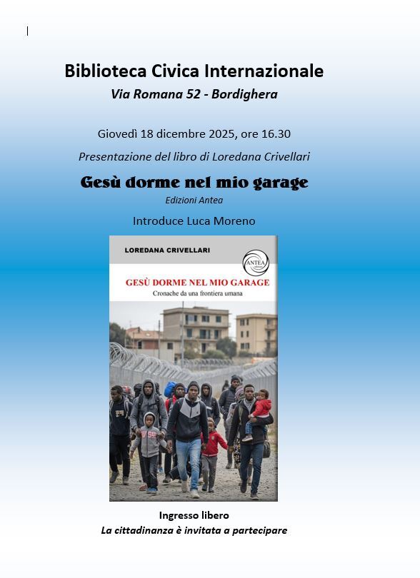 Giovedì 18 dicembre, alle 16.30, la Biblioteca Civica Internazionale di Bordighera ospita la presentazione del volume di Loredana Crivellari "Gesù dorme nel mio garage", con la presentazione di Luca Moreno.