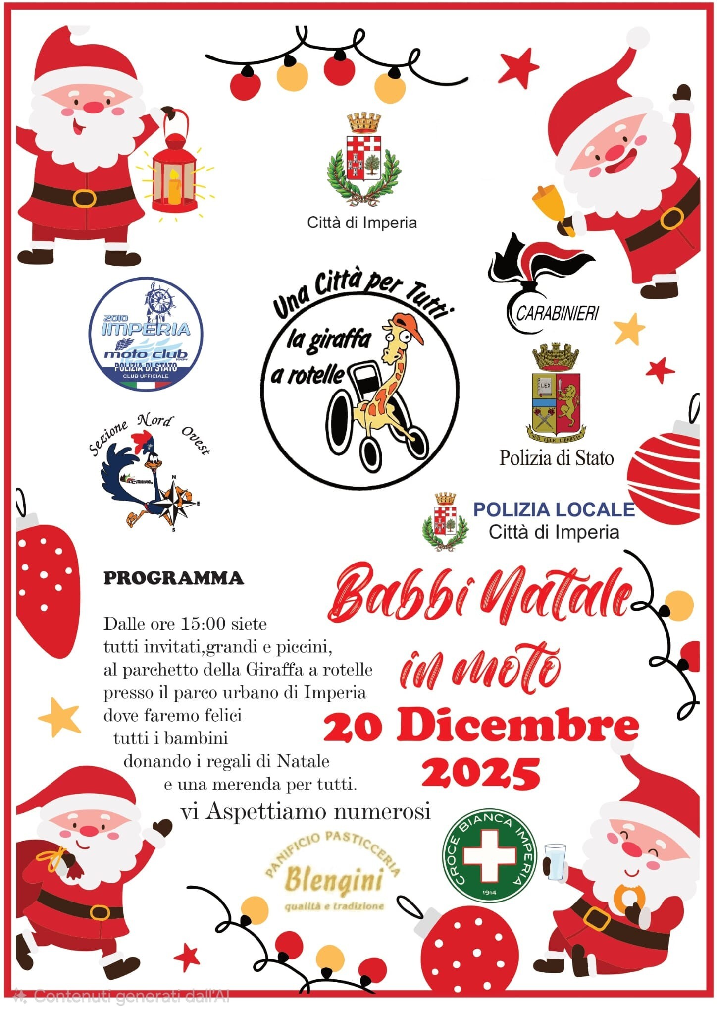 Dalle ore 15:00 siete tutti invitati, grandi e piccini, al parchetto della Giraffa a rotelle presso il parco urbano di Imperia dove faremo felici tutti i bambini donando i regali di Natale e una merenda per tutti.