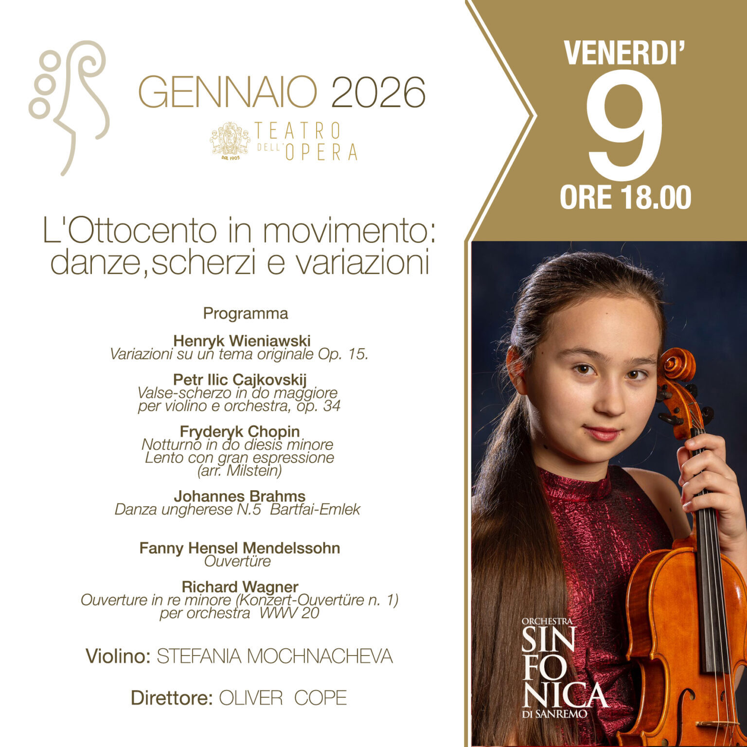 Un viaggio musicale tra virtuosismo, eleganza e passione romantica con l’Orchestra #SinfonicaSanremo, diretta dal M° Oliver Cope e la giovane violinista Stefania Mochnaceva.