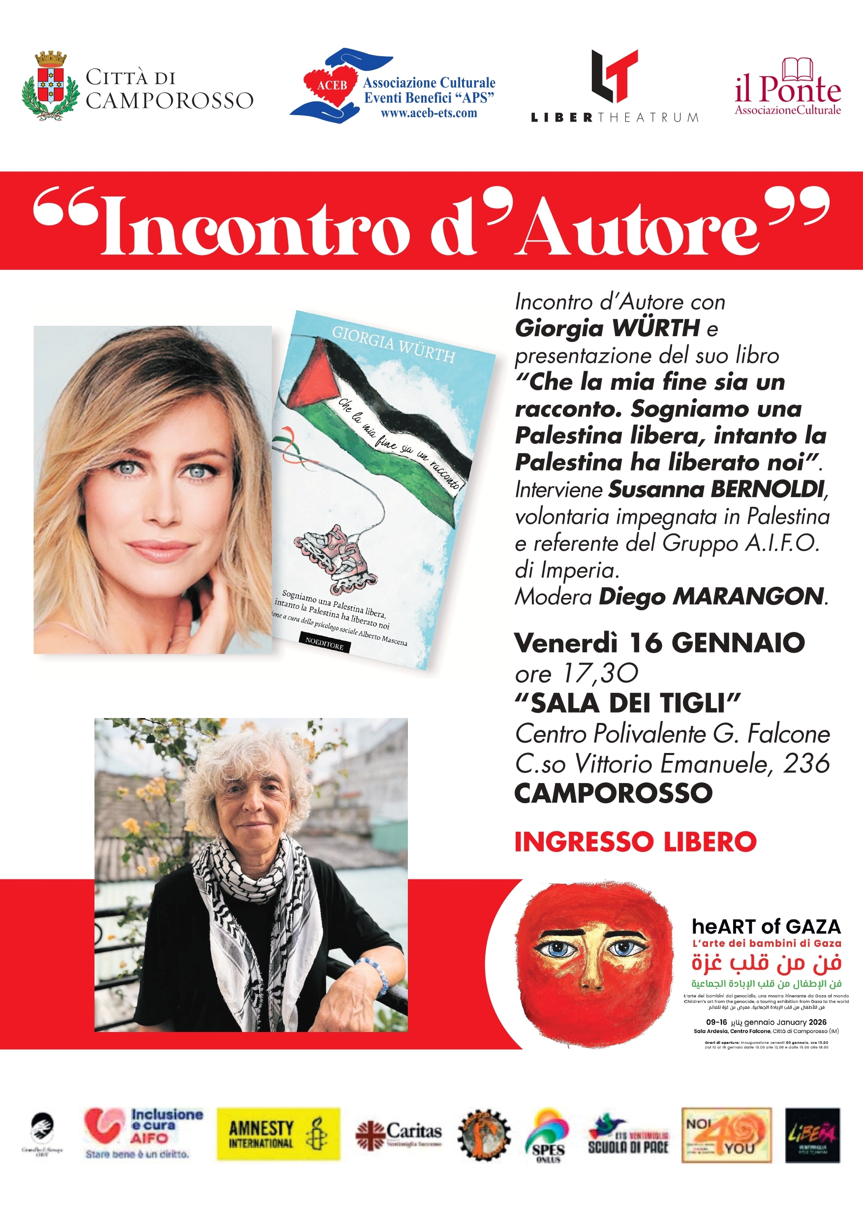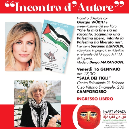 Incontro d'Autore con Giorgia WÜRTH e presentazione del suo libro "Che la mia fine sia un racconto. Sogniamo una Palestina libera, intanto la Palestina ha liberato noi". Interviene Susanna BERNOLDI, volontaria impegnata in Palestina e referente del Gruppo A.I.F.O. di Imperia. Modera Diego MARANGON.