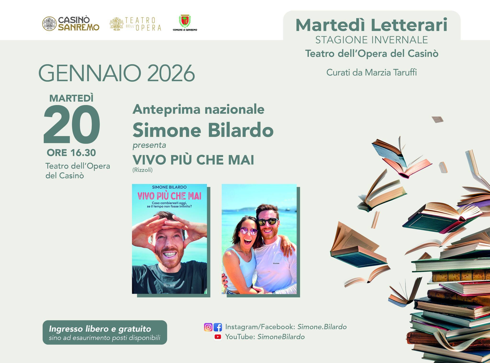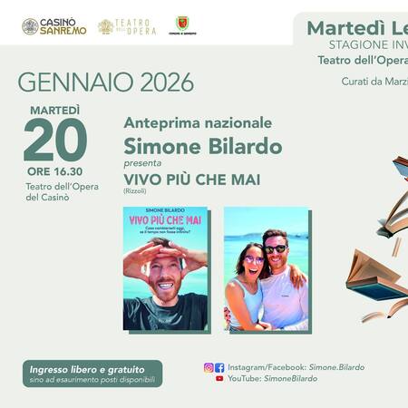 Nell'ambito dei "Martedì Letterari", Simone Bilardo, insieme a Silvia Tettamanti, svelerà in anteprima nazionale il suo libro ‘Vivo più che mai’ (Rizzoli). 🎉