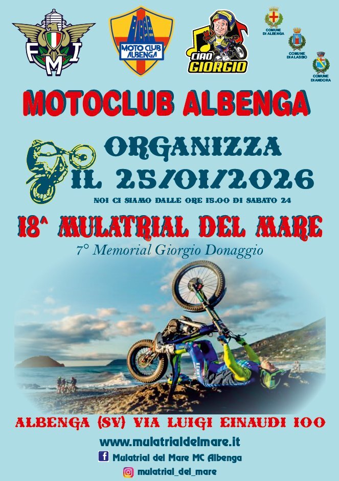 Domenica 25 gennaio 2026 va in scena la 18ª Mulatrial del Mare – 7° Memorial Giorgio Donaggio, organizzata dal Motoclub Albenga.
